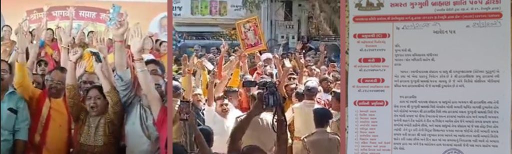 સ્વામિનારાયણના કહેવાતા સંતો દ્વારા અવારનવાર હિન્દુ દેવી દેવતાઓ વિશે અભદ્ર ટિપ્પણી મુદ્દે હિન્દુ સમાજ રોષે ભરાયો છે. આ તરફ તાજેતરમાં ભગવાન દ્વારકાધીશ વિશે કરવામાં આવેલ વિવાદિત ટિપ્પણી બાદ લોકોમાં ભારે આક્રોશ જોવા મળી રહ્યો છે. આ બધાની વચ્ચે આજે દ્વારકા ખાતે દ્વારકાધીશ પુજારી તેમજ સમસ્ત ગૂગળી બ્રાહ્મણ 505 અને હિન્દુ સંગઠનો વિશાળ રેલી યોજી હતી. આ સાથે ભગવાન દ્વારકાધીશ મંદિરેથી જઉખ કચેરી સુધી વિવિધ સૂત્રોચાર સાથે ચુસ્ત પોલીસ બંદોબસ્ત વચ્ચે રેલી યોજી અને આવેદનપત્ર પાઠવ્યું છે. સ્વામિનારાયણ સંપ્રદાય દ્વારા ફરી એક વાર સનાતન ધર્મને ટાર્ગેટ કરવામાં આવ્યો છે. હકીકતમાં મણિનગર સ્વામિનારાયણ મંદિરે સનાતન ધર્મ વિરુદ્ધ પુસ્તક પ્રકાશિત કર્યુ જેમાં સનાતન ધર્મનું અપમાન કરવામાં આવ્યું છે.