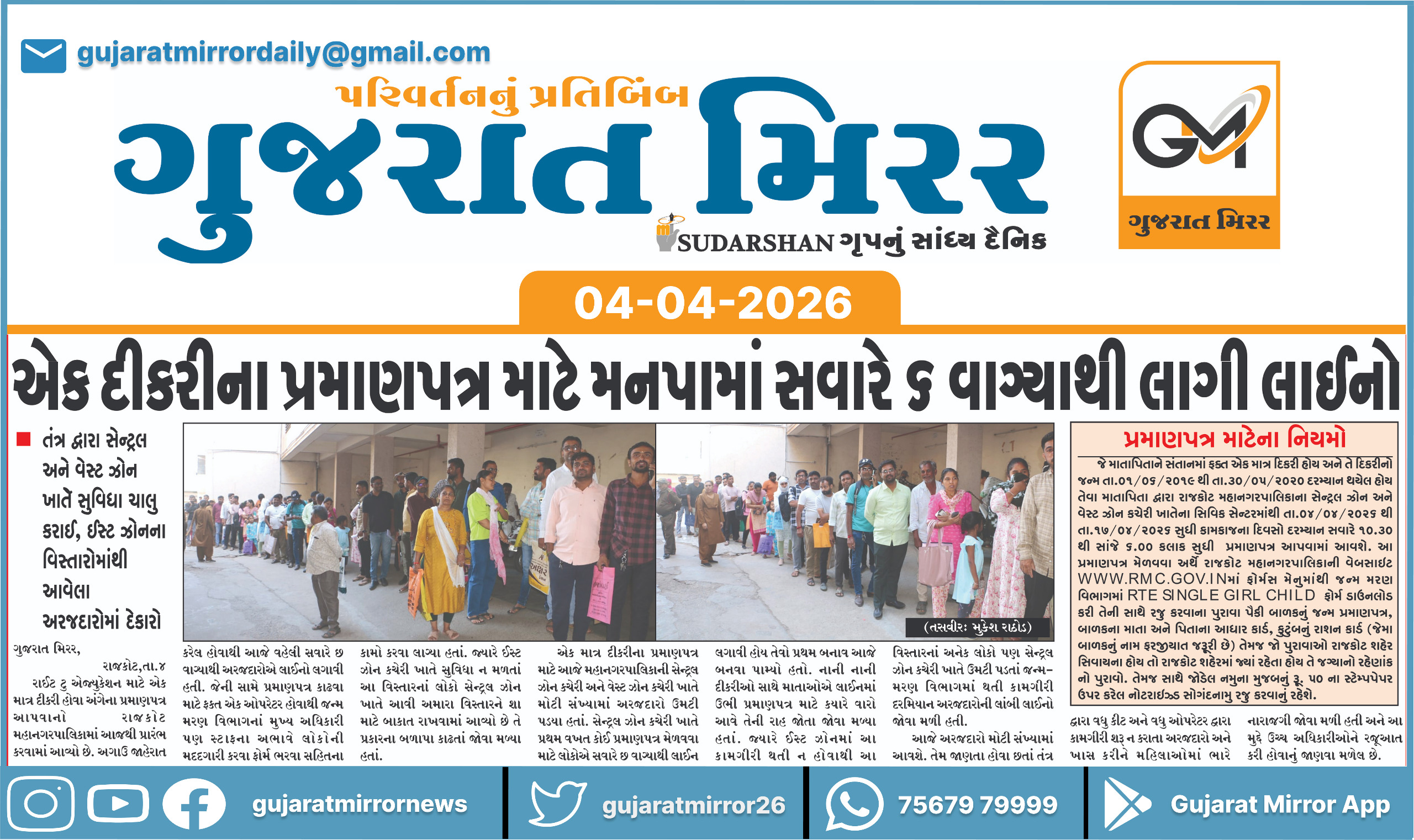 એક માત્ર દીકરીના પ્રમાણપત્ર માટે આજે મહાનગરપાલિકાની સેન્ટ્રલ ઝોન કચેરી અને વેસ્ટ ઝોન કચેરી ખાતે મોટી સંખ્યામાં અરજદારો ઉમટી પડયા હતાં. સેન્ટ્રલ ઝોન કચેરી ખાતે પ્રથમ વખત કોઈ પ્રમાણપત્ર મેળવવા માટે લોકોએ સવારે છ વાગ્યાથી લાઈન લગાવી હોય તેવો પ્રથમ બનાવ આજે બનવા પામ્યો હતો. નાની નાની દીકરીઓ સાથે માતાઓએ લાઈનમાં ઉભી પ્રમાણપત્ર માટે કયારે વારો આવે તેની રાહ જોતા જોવા મળ્યા હતાં. જ્યારે ઈસ્ટ ઝોનમાં આ કામગીરી થતી ન હોવાથી આ વિસ્તારનાં અનેક લોકો પણ સેન્ટ્રલ ઝોન કચેરી ખાતે ઉમટી પડતાં જન્મ-મરણ વિભાગમાં થતી કામગીરી દરમિયાન અરજદારોની લાંબી લાઈનો જોવા મળી હતી છતાં ઓછા સ્ટાફથી તમામ અરજદારોને સર્ટી.આપવામાં આવ્યા હતાં.
