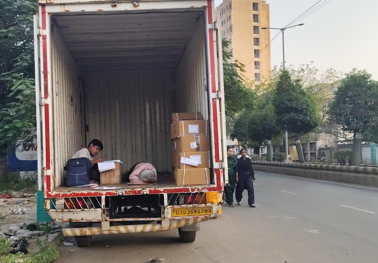 સરકારે શિક્ષણનું વ્યાપારીકરણ કરી નાખ્યું હોવાથી ગરીબોના સંતાનો માટે શિક્ષણ મેળવવુ ‘અઘરૂ’ બની ગયૂ છે, આમ છતા ‘મન હોય તો માળવે જવાય’ તે કહેવત મુજબ રાજકોટમાં જામનગર રોડ ઉપર છૂટ્ટક સામાનની ફેરી કરતા એક ગરીબ ટેમ્પાવાળાનો પુત્ર ટેમ્પામાં બેસીને જ ભણતરમાં મશગુલ થઇ ગયેલો જોઇ શકાય છે. પુત્રની અભ્યાસ પ્રત્યેની આ રૂચી જોઇને પિતા પણ ટેમ્પામાં જ નિરાંતની ઉંઘ માણતા નજરે પડયા હતા. (તસવીર: મૂકેશ રાઠોડ )