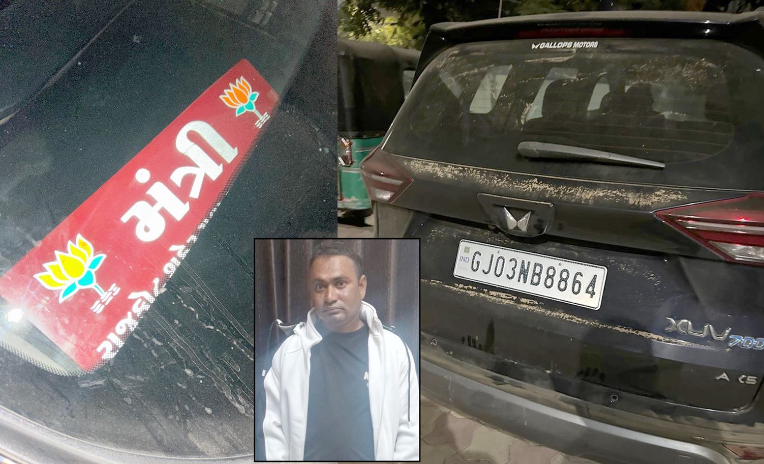 પોલીસમાથી મળતી વિગતો મુજબ બી ડીવીઝન પોલીસ મથકના પીઆઇ એસ. એસ. રાણેની રાહબરીમા હેડ કોન્સ્ટેબલ હિતેષભાઇ જોગડા, હાર્દિકભાઇ છૈયા, રાજાભાઇ ગઢવી અને હોમગાર્ડ સહીતનો સ્ટાફ રાત્રીના બે વાગ્યે પેટ્રોલીંગમા હતો ત્યારે ગ્રીનલેન્ડ ચોકડીથી મોરબી રોડ તરફ જતા રસ્તે એક એસયુવી 700 જીજે 03 એનબી 8864 નંબરની કાળા કલરની કાર જેમા આગળ રાજકોટ શહેર ભાજપ મંત્રી લખેલી નેમ પ્લેટ હતી. જે અટકાવી ચાલકનુ નામ પુછતા પોતે ગ્રીનલેન્ડ ચોકડી પાસે ચામુંડા પાન વાળી શેરીમા હરસિધ્ધી પાર્ક શેરી નં 4 મા રહેતા સુરેશ વાલજી મકવાણા (ઉ.વ. 33) હોવાનુ જણાવ્યુ હતુ. તેમજ કારની તલાસી લેતા તેમાથી એક દારૂની બોટલ મળી આવી હતી. દારૂની બોટલ અંગે પુછપરછ કરતા સુરેશે સરખો જવાબ આપ્યો ન હતો અને પોતે ઇમીટેશનનો ધંધાર્થી હોવાનુ જણાવ્યુ હતુ.