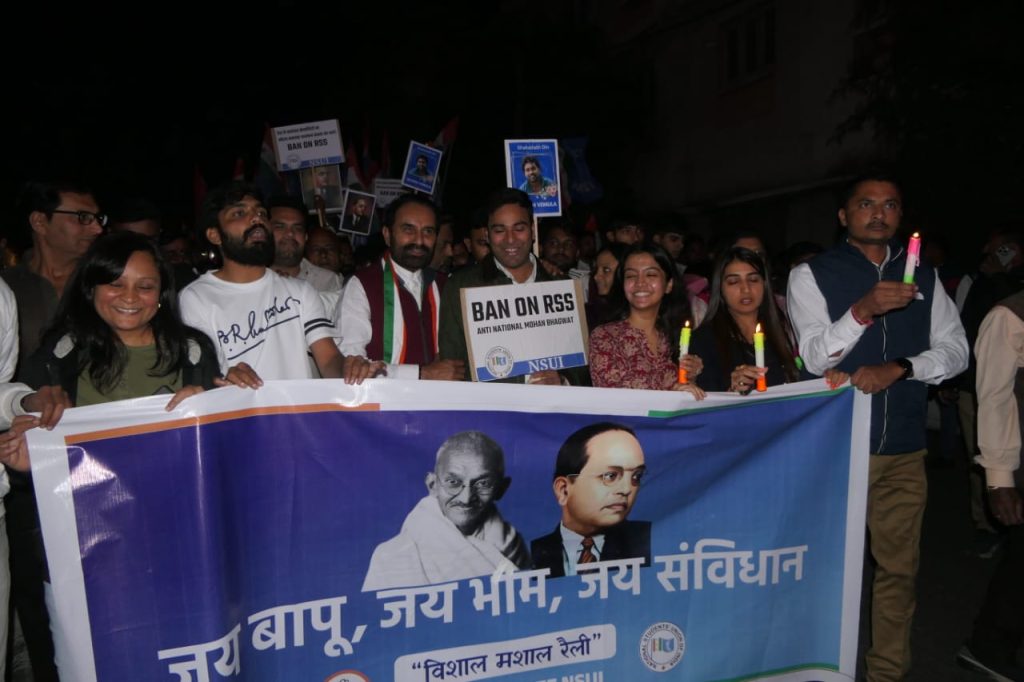 રાજકોટમાં ગુજરાત કોંગ્રેસ અધ્યક્ષ શક્તિસિંહ ગોહિલ અને NSUI ના રાષ્ટ્રીય અધ્યક્ષ વરુણ ચૌધરીની આગેવાનીમાં મશાલ રેલીનું આયોજન કરવામાં આવ્યું હતુ. જેમાં મોટી સંખ્યામાં NSUI ના કાર્યકરો હાજર રહ્યા હતા. કોંગ્રેસના પ્રદેશ અધ્યક્ષ શક્તિસિંહ ગોહિલે જણાવ્યું હતુ કે, સંવિધાનની વાત, મહાત્મા ગાંધીજીના વિચારો અને બાબા સાહેબ આંબેડકરના સંવિધાનના માન રૂૂપે આ મશાલ રેલીનું આયોજન કરવામાં આવ્યું છે. ભાજપે હંમેશા બાબા સાહેબનો વિરોધ કર્યો છે. હાલમાં જ અમિત શાહે પણ રાજ્યસભામાં બાબા સાહેબનું અપમાન કર્યું છે.