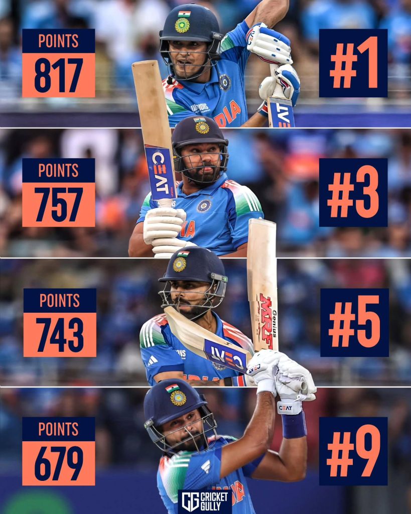 આંતરરાષ્ટ્રીય ક્રિકેટ પરિષદ (ICC) ન ફક્ત ટીમ રેન્કિંગ પર નજર રાખે છે પરંતુ તમામ ખેલાડીઓના બેટિંગ અને બોલિંગ પ્રદર્શન પર પણ નજર રાખે છે. ભારતીય ખેલાડીઓ ICC રેન્કિંગમાં પ્રભુત્વ ધરાવે છે. ટેસ્ટ, ODI અને T20 બેટિંગ રેન્કિંગમાં નવ ભારતીય ખેલાડીઓનો સમાવેશ થાય છે. આ યાદીમાં શુભમન ગિલ, રોહિત શર્મા, વિરાટ કોહલી, શ્રેયસ ઐયર અને અભિષેક શર્મા સહિત અનેક સ્ટાર ખેલાડીઓનો સમાવેશ થાય છે.