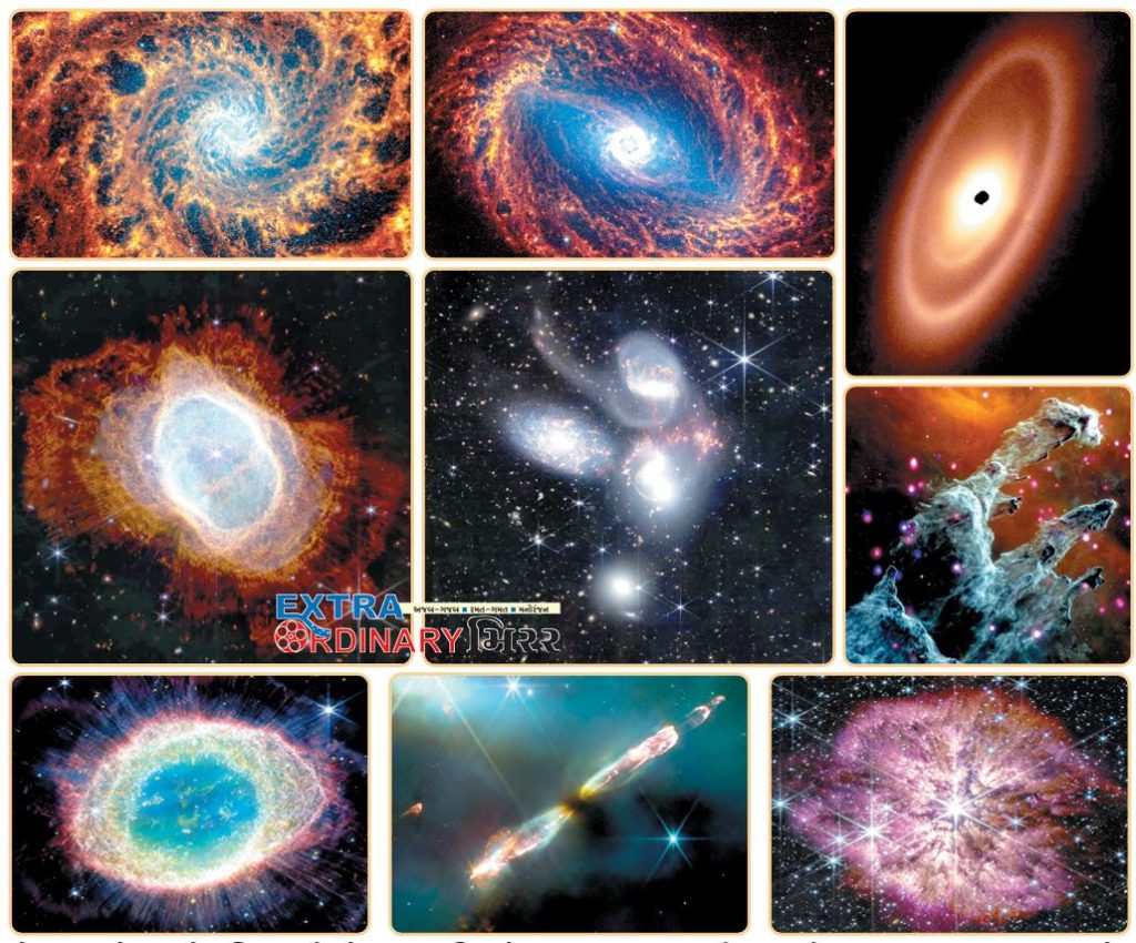 બ્રહ્માંડની દુનિયા આમ માનવીથી માંડીને ખગોળ પ્રેમીઓ માટે કાયમ આકર્ષણનું કેન્દ્ર રહી છે. કુદરતની આ અદ્ભુત કરામતને સમજવાના અને માણવાના પ્રયાસો સતત થતાં રહે છે જેમ્સ વેબ ટેલિસ્કોપને 2021માં લોન્ચ કરવામાં આવ્યા બાદ 2022થી તેણે ડેટા એકત્રિત કરવાનું શરૂ કર્યુ હતું. જેમ્સવેબ ટેલિસ્કોપ દ્વારા લેવામાં આવેલી અદ્ભુત તસવીરો નાસા દ્વારા જાહેર કરવામાં આવી છે. ર્સ્પાકાર ગેલેક્સી, પ્રચંડ પિનહિલ્સ, આકાશગંગા, તારાના શિલ્પો સહિતનો નયનરમ્ય નજારો તસવીરોમાં જોવા મળી રહ્યો છે.