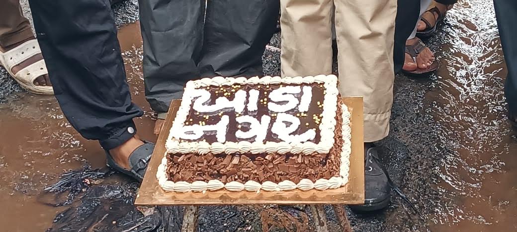 જ્યાં નાગરિકોને એકત્ર કરાયા હતા, અને કેક કાપીને કટાક્ષના સ્વરૂૂપમાં તેનું કટીંગ કરવામાં આવ્યું હતું. આ ઉપરાંત રોડની વચ્ચે જ્યાં મોટા ખાડા પડેલા છે, ત્યાં જાહેરમાં પાટા પીડી કરવામાં આવી હતી, અને રોડને થિગડા મારવાનો પ્રયાસ કર્યો હતો. જેથી તંત્ર જાગૃત બને અને આ વિસ્તારના રોડ રસ્તાને સરખા બનાવે, તે મુદ્દે વિરોધ દર્શાવવાની સાથે મરામતની માંગણી કરી હતી.