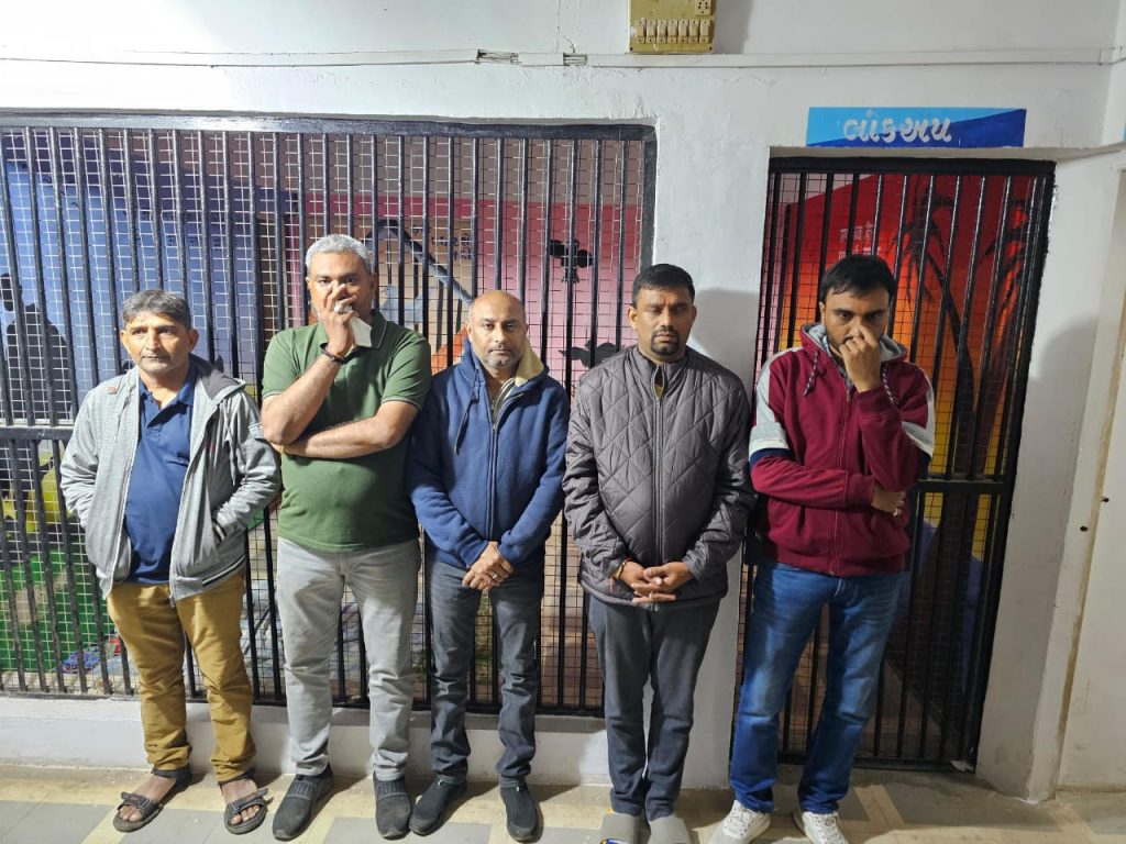 પકડાયેલ ઇસમો (1) જીગરભાઇ પ્રવીણભાઇ પંડયા ઉ વ-45 રહે. બરોડા (2) મીલીનભાઈ ધરમેન્દ્રભાઈ મહેતા, ઉવ-35 રહે. બરોડા (3) અંકુરકુમાર ચંન્દ્રકાન્તભાઈ પારેખ ઉ.વ.42 રહે બાલાસીનોર 4) હીતેનભાઇ યોગેશભાઇ મહેતા ઉ.વ.45 રહે. ઇન્દ્રપુરી ચોક (5) મુકેશભાઇ દેવશીભાઈ જીવાણી ઉ.વ.49 . તાલાલા કબ્જે કરેલ મુદામાલ (1) વિદેશી બનાવટની 01 લીટરની બોટલ અર્ધી ભરેલ જેમા આશરે 500 એમ.એલ જેટલી હોય જેની કીમત રૂૂપીયા 1200 (ર) વિદેશી બનાવટની ટીચર્સ હીન્ગલેન્ડ ક્રીમ બ્લેન્ડેડ સ્કોચ વ્હીસ્કી 375 એમ.એલ.ની બોટલ હોય જેમાં આશરે 300 એમ.એલ બોટલ ભરેલ જેની કીમત રૂૂપીયા 500/-(3) પ્લાસ્ટીકના ખાલી ગ્લાસ 05 જેની કિ.રૂૂા.50 કુલ મુદામાલ કી.રૂૂ.1750/-આ કામગીરી કરનાર અધિ કર્મચારીઓ એલ.સી.બી. ઇ.ચા. પો.ઇન્સ.એ.બી.જાડેજા, પો.સબ ઇન્સ. એ.સી.સિંધવ