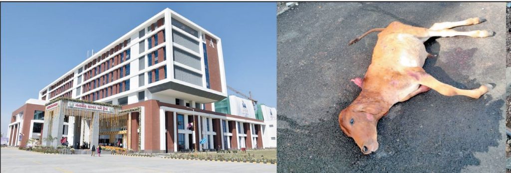 રાજકોટ શહેરની ભાગોળે એઇમ્સ હોસ્પિટલ અને પરાપીપળીયા સહીતના વિસ્તારોમાં છેલ્લા કેટલાક દિવસથી ધામા નાખીને બેઠેલા દીપડાએ ગત રાતે એઇમ્સની ગર્લ્સ હોસ્ટેલના રસ્તામાં જ એક વાછરડીનું મારણ કરતા ગર્લ્સ હોસ્ટેલની છાત્રાઓ અને એઇમ્સના સ્ટાફમાં ફફડાટની લાગણી ફેલાયેલ છે.