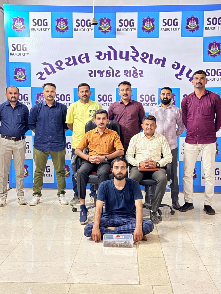 મળતી વિગતો મુજબ પોલીસ કમિશ્નર બ્રજેશ કુમાર ઝા, અધિક પોલીસ કમિશ્નર ચૈતન્ય મંડલીક, ડીસીપી ક્રાઈમ જગદીશ બાંગરવા તથા એસીપી ક્રાઈમ ભરત બી. બસીયા તરફથી રાજકોટ શહેર વિસ્તારમાં યુવાધન નશાના રવાડે ના ચડે તથા નાર્કોટીકસ પદાર્થોનું વેચાણ અટકાવવા “”SAY NO TO DRUGS”” મિશન અંતર્ગત નાર્કોટીકસ પદાર્થોનું ખરીદ-વેચાણ કે સેવન કરનારા ઇસમો વિરૂૂધ્ધ કડક કાયેવાહી કરવા સુચના આપેલ હોય જે સબંધે એસ.ઓ.જી.ના પોલીસ ઇન્સપેક્ટર એસ.એમ.જાડેજાના માર્ગદર્શન હેઠળ પુષ્કરધામ મેઈન રોડ ઉપર જે.કે.ચોક પાસે પટેલ રેસ્ટોરન્ટ પાસે જાહેરમાં હાઇબ્રીડ ગાંજાના જથ્થા સાથે મૂળ મુંબઈના ઇસ્ટ થાણે મીરા રોડ ઇકોસીટીના વતની અને હાલ શિતલ પાર્ક શેરી નં.02, શિવ શક્તિ સોસાયટી બ્લોક નં.9 રાજકોટ મુળ રહે- સ્પ્રીંગ બિલ્ડીંગ સંઘવી એસ-3માં રહેતા શેર બ્રોકર ધ્રુવ સંજયભાઈ જોષી (ઉ.વ.26)ની ધરપકડ કરી તેની પાસેથી રૂૂ.2.42 લાખના 69.380 ગ્રામ હાઈબ્રીડ ગાંજો સહીત રૂૂ. 3.62 લાખનો મુદ્દમાલ કબજે કર્યો હતો. પ્રાથમિક તપાસમાં પકડાયેલ શેર બ્રોકર ધ્રુવ જોષી આ ગાંજો અમદાવાદથી લાવ્યો હોવાનું તેણે જણાવ્યું હતું.