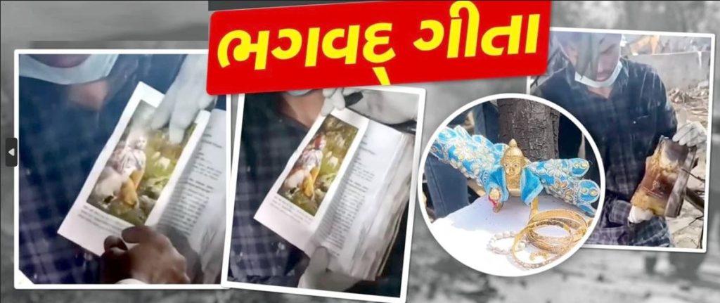 બધાને એ જોઈને આશ્ચર્ય થયું કે ચારે વસ્તુઓ બળીને ખાખ થઈ હતી, પરંતુ ભગવદ્ ગીતાને કાંઈ થયું ન હતુ.આ ચમત્કારિક ઘટનાનો વીડિયો સોશિયલ મીડિયા પર વાયરલ થઈ રહ્યો છે, જેમાં સ્પષ્ટપણે જોઈ શકાય છે કે ભગવદ-ગીતાના પુસ્તકને કાટમાળમાંથી સંપૂર્ણપણે અકબંધ સ્થિતિમાં બહાર કાઢવામાં આવી છે, આ દ્રશ્ય માત્ર અદ્ભુત નથી પણ લાખો લોકો માટે શ્રદ્ધા અને આસ્થાનું પ્રતીક બની ગયું છે.