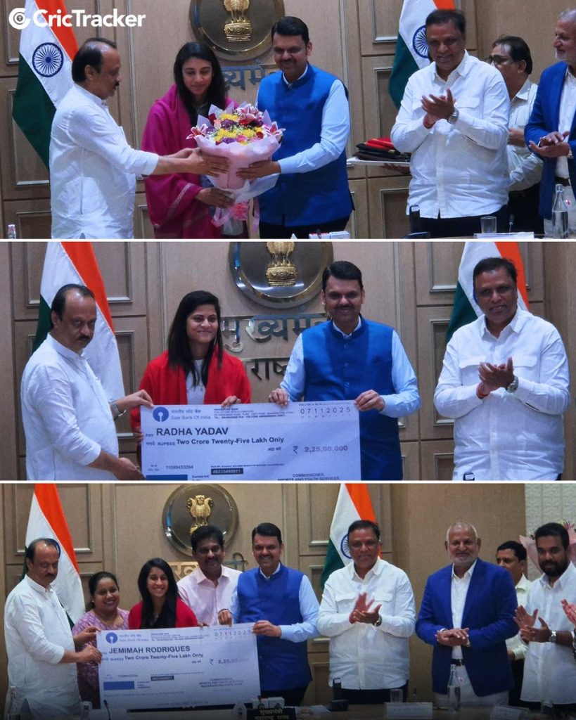 મહારાષ્ટ્રના મુખ્યમંત્રી દેવેન્દ્ર ફડણવીસે મુંબઈમાં એક ખાસ સન્માન સમારોહ દરમિયાન મહિલા ક્રિકેટ વર્લ્ડ કપ વિજેતા ટીમના ત્રણ સ્ટાર ખેલાડીઓ – સ્મૃતિ મંધાના, જેમીમા રોડ્રિગ્સ અને રાધા યાદવનું સન્માન કર્યું હતું. મુખ્યમંત્રી દેવેન્દ્ર ફડણવીસે ત્રણેય ખેલાડીઓને ₹2.25 કરોડના રોકડ પુરસ્કારો અર્પણ કર્યા અને તેમને મહારાષ્ટ્રનું ગૌરવ ગણાવ્યા હતા.