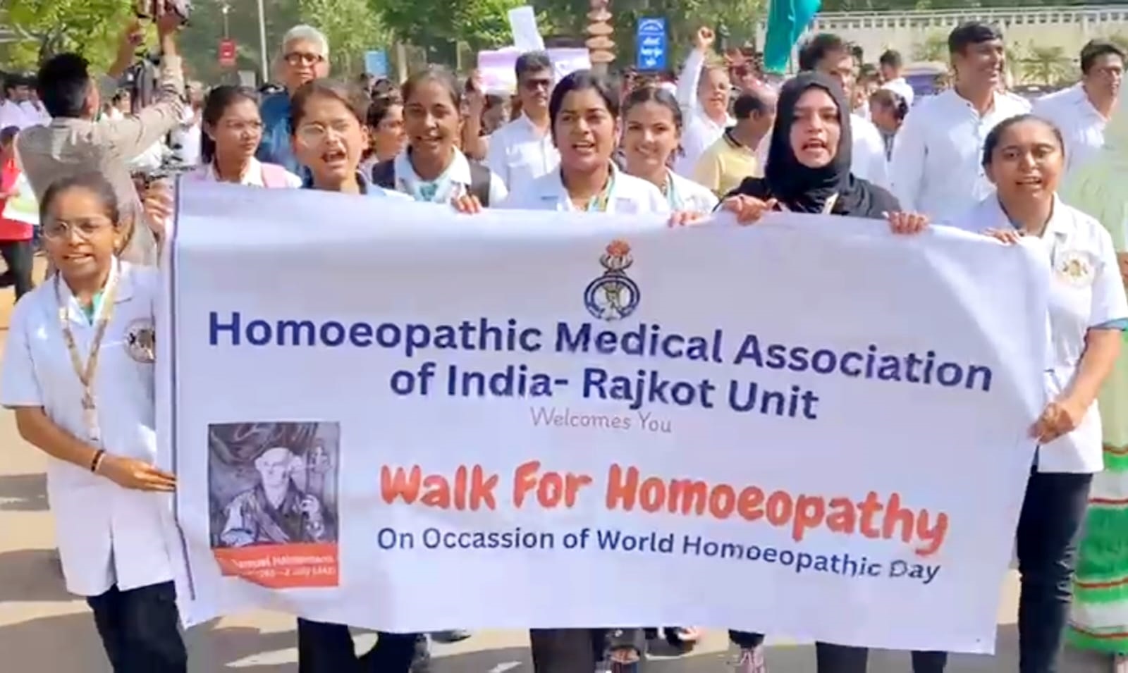 “વર્લ્ડ હોમિયોપેથિક ડે” ના ઉપલક્ષમાં લોકોમાં હોમિયોપેથી ચિકિત્સા પદ્ધતિ વિશે જાગૃતિ લાવવાના હેતુથી HMAI(હોમિયોપેથીક મેડીકલ એસોસિએશન ઓફ ઇન્ડિયા) રાજકોટ બ્રાન્ચ દ્વારા રેસકોર્સ રિંગ રોડ ખાતે ઐતિહાસિક વોક ફોર હોમિયોપેથી મહારેલીનું સફળ આયોજન કરવામાં આવ્યું હતું. જેમાં 1500 થી વધુ હોમિયોપેથીક ડોક્ટર્સ અને વિદ્યાર્થીઓએ ભાગ લીધો હતો. ધી હોમિયોપેથિક મેડિકલ એસોસિએશન ઓફ ઈન્ડિયા (HMAI) એ દેશના લાયકાત ધરાવતા હોમિયોપેથિક તબીબોની સૌથી મોટી અને પ્રતિષ્ઠિત રાષ્ટ્રીય સંસ્થા છે. HMAI ની રાજકોટ બ્રાન્ચ સમાજમાં સ્વાસ્થ્ય જાગૃતિ લાવવા, મેડિકલ કેમ્પ યોજવા, તબીબોના જ્ઞાનવર્ધન માટે સતત શૈક્ષણિક સેમિનાર (CME) યોજવા અને હોમિયોપેથીના પ્રચાર-પ્રસાર માટે સક્રિયપણે અને નિ:સ્વાર્થભાવે કાર્યરત છે. (તસવીર : મુકેશભાઈ રાઠોડ)