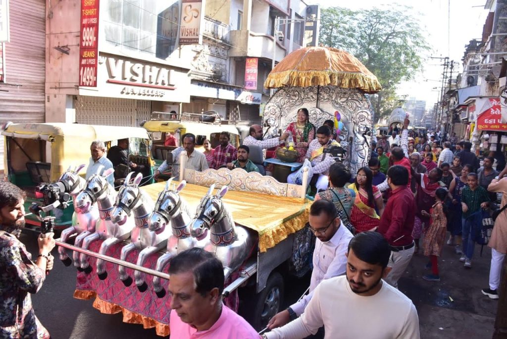 જ્યારે બપોરે 2 કલાકે સંયમવેશના વધામણા, રાત્રે 8 કલાકે પ્રભુભક્તિ વિશિષ્ટ આરતી તા.31-1-2025ના સવારે 9 કલાકે વરસીદાનની શોભાયાત્રા, બપોરે 12:39 કલાકે શક્રસ્તવ અભિષેક, રાત્રે 8 કલાકે સંયમપંથીને પ્રેમે વિદાય, તા.1-2-2025 ના નિર્મલ વસંત વિરતિ વાટિકામાં દેવ-ગુરૂૂના સંગે મુમુક્ષુનું આગમન ત્યારબાદ શુભમુહૂર્તે વિરતિધર્મ આરોપણ ક્રિયા આરંભ ઓઘો અર્પણ, કેશલોચન, સર્વસાવધ યોગ પચ્ચખાણ, નુતન નામકરણ કરવામાં આવશે. તેમ રત્નકુક્ષી પરિવાર ભણસાલી લલિતાબેન મનસુખલાલ છગનલાલ તથા ઇલાબેન શૈલેષભાઈ ભણસાલી, ધૈર્ય ભણસાલીની યાદીમાં જણાવાયું છે.