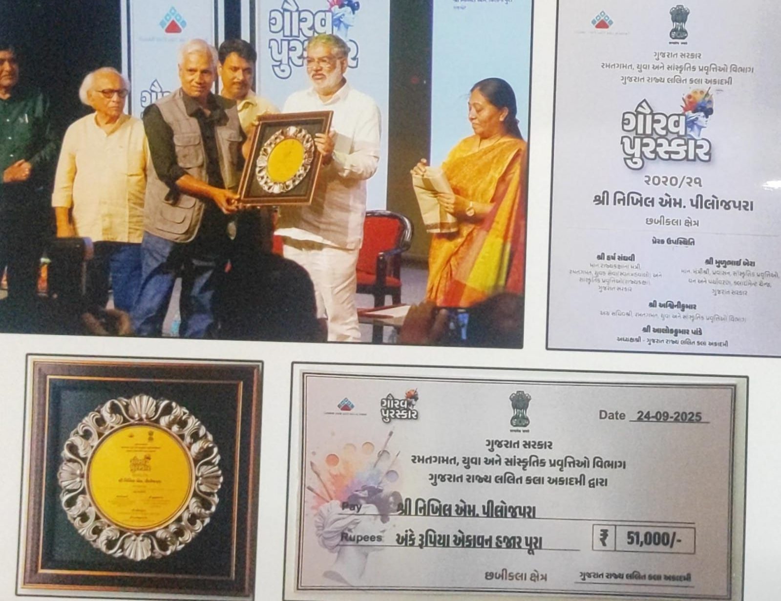 ગુજરાત રાજ્ય લલિત કલા અકાદમી દ્વારા છબીકલા (ફોટોગ્રાફી) ચિત્રકલા તથા શિલ્પ કલા ક્ષેત્રે વિશિષ્ટ પ્રદાન બદલ 26 કલાકારોને સન્માનિત કરવાનો ભવ્ય કાર્યક્રમ ગાંધીનગર ટાઉનહોલમાં તારીખ 24-09-2025 ના રોજ યોજાયો. સાથે સાથે ર4 કલાકારોની પાંચ પાંચ સુંદર કલાકૃતિનું પ્રદર્શન પણ યોજવામાં આવ્યું હતું.