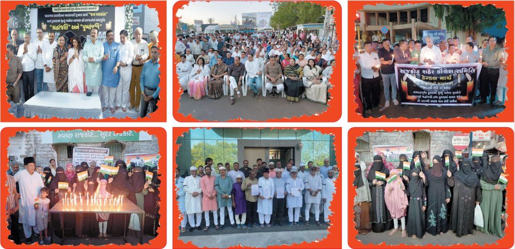 કાશ્મીરના પહેલગામ ખાતે નિર્દોષ પ્રવાસીઓની પાકિસ્તાન સમર્થિત ત્રાસવાદીઓએ કરેલી અમાનવીય કત્લેઆમના પગલે સમગ્ર દેશની જનતામાં ભારે આઘાત સાથે આક્રોશની લાગણી જોવા મળી રહી છે અને ઠેર ઠેર પાકિસ્તાન વિરોધી દેખાવો થઇ રહયા છે ત્યારે રાજકોટમાં પણ ભાજપ-કોંગ્રેસ સહિતના રાજકીય સંગઠનો, વિવિધ સંસ્થાઓ અને સમાજ દ્વારા દિવંગતો પ્રત્યે સંવેદના વ્યકત કરવામાં આવી હતી. ખાસ કરીને મુસ્લિમ સમાજે આ જઘન્ય હત્યાકાંડને માનવતા અને ઇસ્લામ વિરૂધ્ધનું કૃત્ય ગણાવ્યુ હતુ. મુસ્લિમ સમાજની મહિલાઓ પણ વિરોધમાં જોડાઇ હતી અને મૃતકો પ્રત્યે સંવેદના વ્યકત કરી હતી. મુસ્લિમ સમાજે ગઇકાલે આ હત્યાકાંડના વિરોધમાં જિલ્લા કલેકટરને આવેદનપત્ર પણ પાઠવ્યુ હતુ. (તસ્વીર : મુકેશ રાઠોડ)