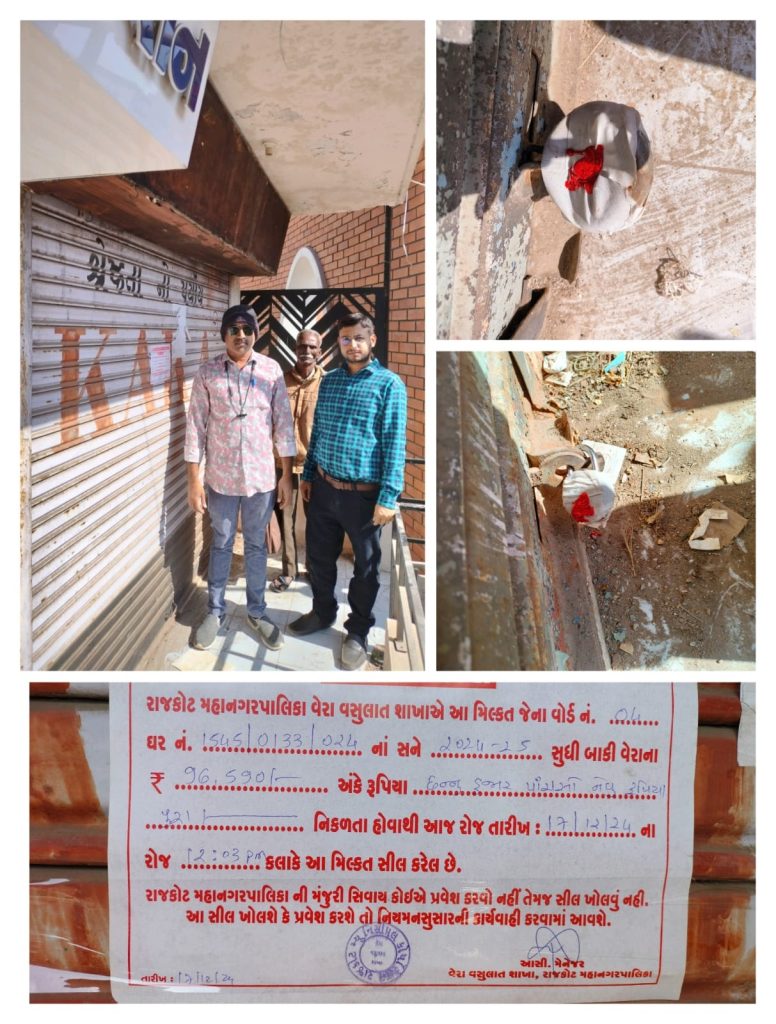 મનપાના વેરાવિભાગ દ્વારા નાના મૌવા મેઈન રોડ પર લક્ષ્મીનગર ચોક નજીક ક્રિષ્ના પ્લાઝા સામે એપલ ભંગાર નો ડેલો સામે સીલની કાર્યવાહી કરતા રિકવરી રૂૂ.71,500, અમરનગરમાં ભૂચર વિદ્યાલય સામે 1-યુનિટની નોટીસ સામે રિકવરી રૂૂ.75,000, મવડી મેઈન રોડ પર સરસ્વતી સોસાયટીમાં શેરી નં-7મ ઓમ ને નોટીસ સામે રિકવરી રૂૂ.60,00, બાપુનગરમાં વિનોદ હોટેલ શેરી પાયોનીયર એન્જી નજીક 2-યુનીટને સીલ મારેલ.(સીલ), કોઠારીયા રીંગરોડ પર જય સીયારામ ઈન્ડ એરિયામાં એસ.પી.પટેલ ના 1-યુનિટ સામે સીલની કાર્યવાહી કરતા રિકવરી રૂૂ.50,000, આજી વસાહતમાં આઈ.ઓ.સી.પેટ્રોલ પંપ નજીક શિવમ ઈન્ડ એરિયામાં ગણેશ ફ્રેમ વર્કસ સામે સીલ ની કાર્યવાહી કરતા ઙઉઈ ચેક આપેલ. હરી ઓદ્યોગિક વિસ્તારમાં 2-યુનિટની નોટીસ સામે સીલ મારેલ હતું.