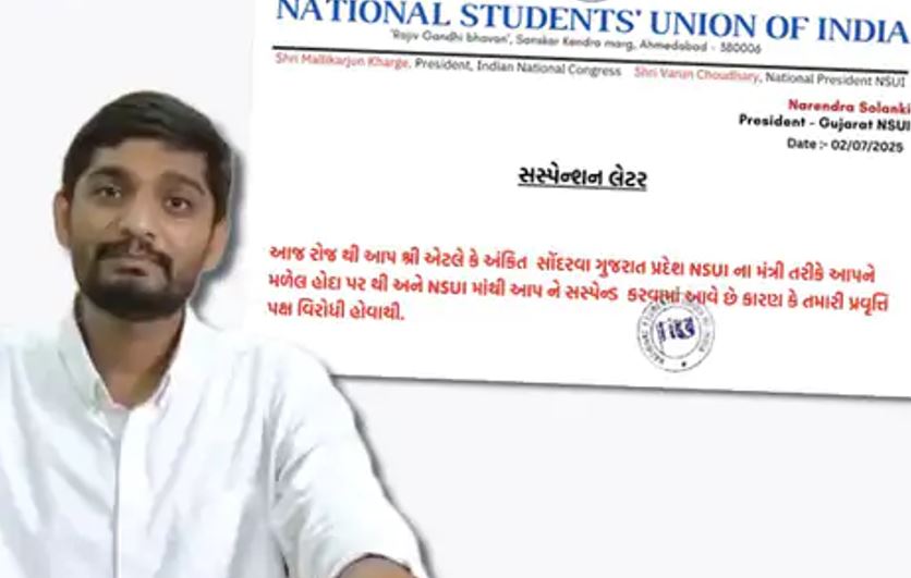 ગુજરાત પ્રદેશ NSUIના પ્રમુખ નરેન્દ્ર સોલંકી દ્વારા મંત્રી અંકિત સોંદરવાને પક્ષ વિરોધી પ્રવૃત્તિઓ બદલ સસ્પેન્ડ કરવામાં આવ્યા છે. આ સસ્પેન્શન પાછળ પ્રાથમિક તબક્કે ભાજપ સાથે સાંઠગાંઠ હોવાનું ચર્ચાઈ રહ્યું છે. જોકે, સસ્પેન્ડ થયા બાદ અંકિત સોંદરવાએ આકરા પ્રહારો કર્યા છે અને સસ્પેન્ડ કરનારા નેતાઓને ચાપલૂસી કરનારા ગણાવી ગંભીર આક્ષેપો કર્યા છે.