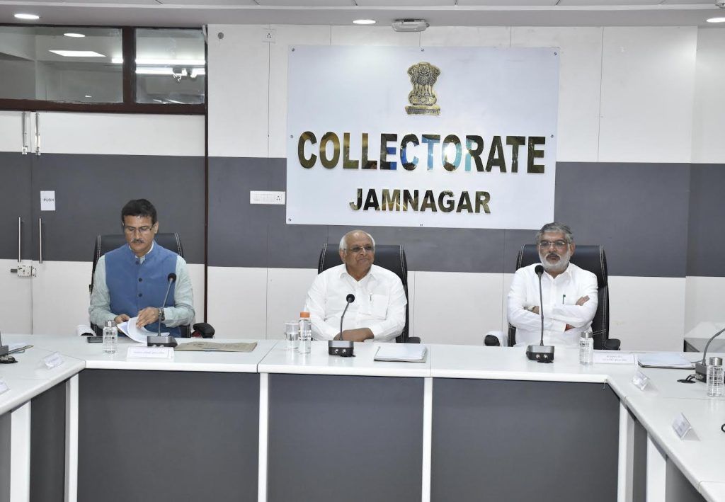 રજીઓ વગેરેની યુદ્ધના ધોરણે કરાયેલી પેન્ડન્સી નિકાલની કામગીરીની સવિસ્તાર વિગતો કલેક્ટરએ મુખ્યમંત્રીને વર્ણવી હતી. NFSA રેશનકાર્ડની E-KYC કામગીરી, કોરોનાની સંભવિત સ્થિતિને પહોંચી વળવાની વહીવટી તંત્રની સજ્જતા, સરકારી જમીન પરના દબાણો દૂર કરવાની કામગીરી, સુજલામ સુફલામ જળ અભિયાન કેચ ધ રેઈન 2.0, મનરેગા, પ્રવાસન, વહીવટી સુધારણા, વગેરેની વિગતોથી મુખ્યમંત્રીશ્રીને કલેકટરશ્રી ઠક્કરે માહિતગાર કર્યા હતા. જિલ્લા વિકાસ અધિકારી વિકલ્પ ભારદ્વાજે જિલ્લાભરમાં થઈ રહેલી વિવિધ કામગીરી મુખ્યમંત્રી સમક્ષ રજૂ કરી હતી. આ બેઠકમાં કેબિનેટ મંત્રી મુળુભાઈ બેરા, સાંસદ પૂનમબેન માડમ, જિલ્લા પંચાયત પ્રમુખ મયબેન ગરસર, ધારાસભ્યઓ સર્વ મેઘજીભાઈ ચાવડા, રિવાબા જાડેજા, દિવ્યેશભાઈ અકબરી, હેમંતભાઈ ખવા, મુખ્ય સચિવ પંકજ જોશી, મુખ્યમંત્રીના સચિવ ડોક્ટર વિક્રાંત પાંડે, મ્યુનિસિપલ કમિશનર ડી.એન.મોદી, પોલીસ અધિક્ષક પ્રેમસુખ ડેલુ, અધિક નિવાસી કલેકટર બી.એન.ખેર તથા સરકારી વિભાગોના અધિકારીઓ અને પ્રતિનિધિઓ ઉપસ્થિત રહ્યા હતા.