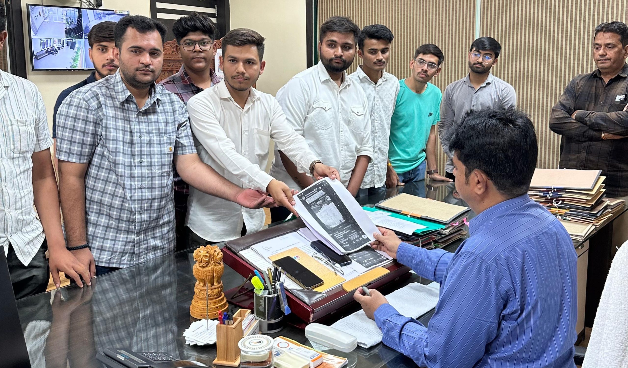 CYSSઆ અંગે આમ આદમી પાર્ટીની CYSSના પ્રદેશ ઉપપ્રમુખ સુરજ બગડાએ જણાવ્યું હતું કે સૌરાષ્ટ્ર યુનિવર્સિટીમાં ફરી એક વખત પેપર લીકની ઘટના સામે આવી છે. જેમાં બીકોમ સેમેસ્ટર 4 ની પરીક્ષા દરમિયાન અમરેલીની એક કોલેજના વિદ્યાર્થીઓના વોટ્સએપ ગ્રુપમાં 10.30 વાગ્યે પેપર શરૂૂ થતા જ પ્રશ્નોના જવાબો વાઇરલ થયા હતા. આ સ્ક્રીન શોટ અનેક ગ્રુપમાં વાઇરલ થયા હોવાનું જાણવા મળ્યું છે. અમે કુલપતિને પણ આ મામલે રજૂઆત મોબાઈલ જો પરીક્ષા સેન્ટરમાં લઈ જવામાં આવે છે ત્યારે કોલેજ શું કરે છે? શું સીસીટીવી દ્વારા મોનિટરિંગ નથી થતું કે કોઈ કોલેજ સાથે આ પ્રકારની બાંધછોડ કરવામાં આવે છે. તેવા સવાલો CYSSના પ્રદેશ ઉપપ્રમુખ સુરજ બગડા(વચ્ચે) તથા આપની છાત્રવિંગના કાર્યકરો દ્વારા કરવામાં આવ્યો છે.