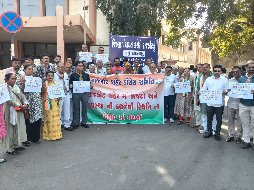 રાજકોટ શહેરમાં કથળેલી કાયદો-વ્યવસ્થાની સ્થિતી સામે રેલી યોજવાની કોંગ્રેસને મંજૂરી નહીં મળતા આજે સવારે પોલીસ કમિશનર કચેરી સામે પ્લેકાર્ડ બતાવીને વિરોધ નોંધાવ્યો હતો.