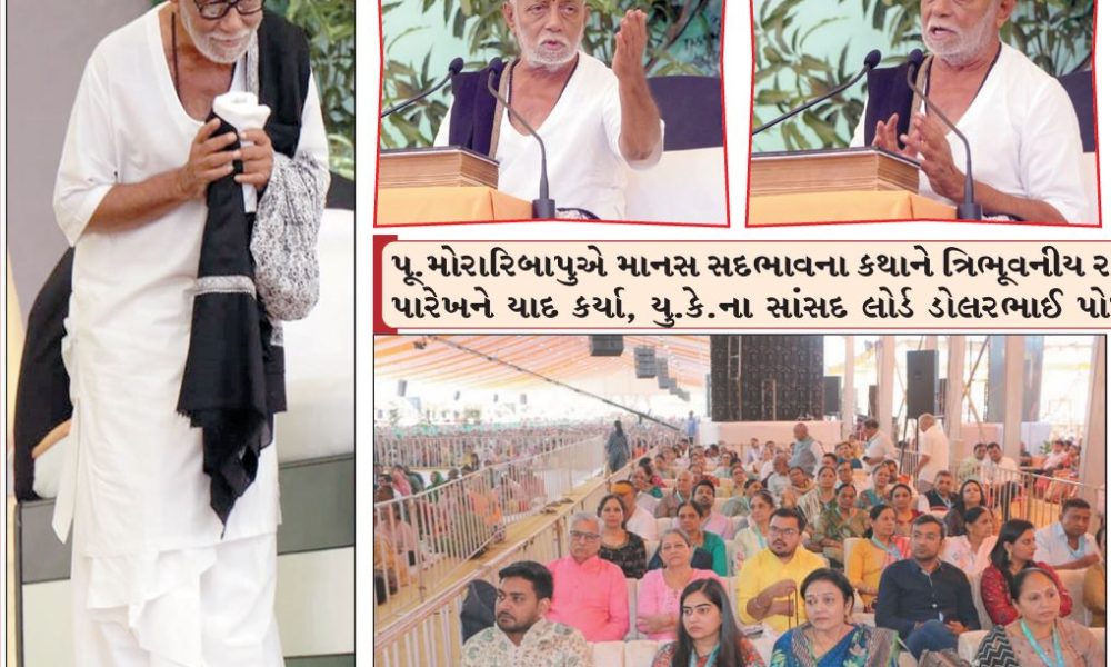 પૂ.મોરારિબાપુએ માનસ સદભાવના કથાને ત્રિભૂવનીય રામ કથા ગણાવી, કવિ રમેશ પારેખને યાદ કર્યા, યુ.કે.ના સાંસદ લોર્ડ ડોલરભાઈ પોપટ કથાશ્રવણ માટે પધાર્યા