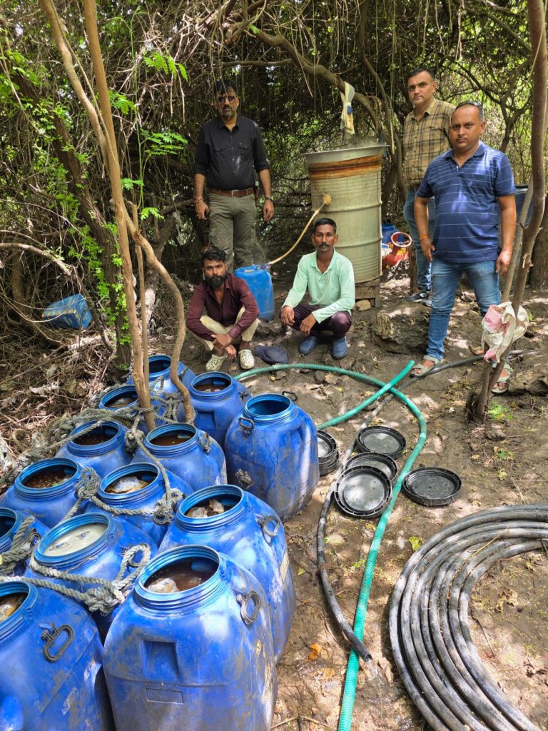 કોડીનાર પો.સ્ટે. વિસ્તારના પેઢાવાડા ગામે બાબરવા નદીના કાંઠે બે ઇસમ દેશીદારૂૂની ભઠ્ઠી ચલાવતો હોય જેને પકડી પાડી કોડીનાર પો.સ્ટે. ગુન્હો રજી.કરી કાયદેસરની કાર્યવાહી કરવામાં આવેલ છે. પકડેલ આરોપીઓ (1) હીતેશભાઇ નાથાભાઇ વાળા, ઉ.વ.29, ધંધો મજુરી રહે. પેઢાવાડા (ર) કીરણ ઉર્ફે કરણ ટપુભાઇ વાઢેળ, ઉ.વ.31, ધંધો મજુરી, રહે.પાવટી, કબ્જે કરેલ મુદામાલ (1) દેશી પીવાનો દારૂૂ ભરેલ પ્લા. નું કેન નંગ-1 દેશી દારૂૂ આશરે લીટર-ર0 કેન સહીત કી.રૂૂ.4020/- (ર) દેશી દારૂૂ બનાવવાનો ઠંડો આથો ભરેલ પ્લા.ના કેરબા નંગ-16 આથો લીટર 800 કેરબા સહીત કી.રૂૂ.20800/- (3) દેશી દારૂૂ બનાવવાનો ગરમ આથી ભરેલ પતરાનુ બેરલ નંગ-1 આથી લીટર 100 બેરલ સહીત કી.રૂૂ.2700/- મળીને કુલ મુદામાલ કી.રૂૂ.47,920/- કબજે કર્યો.