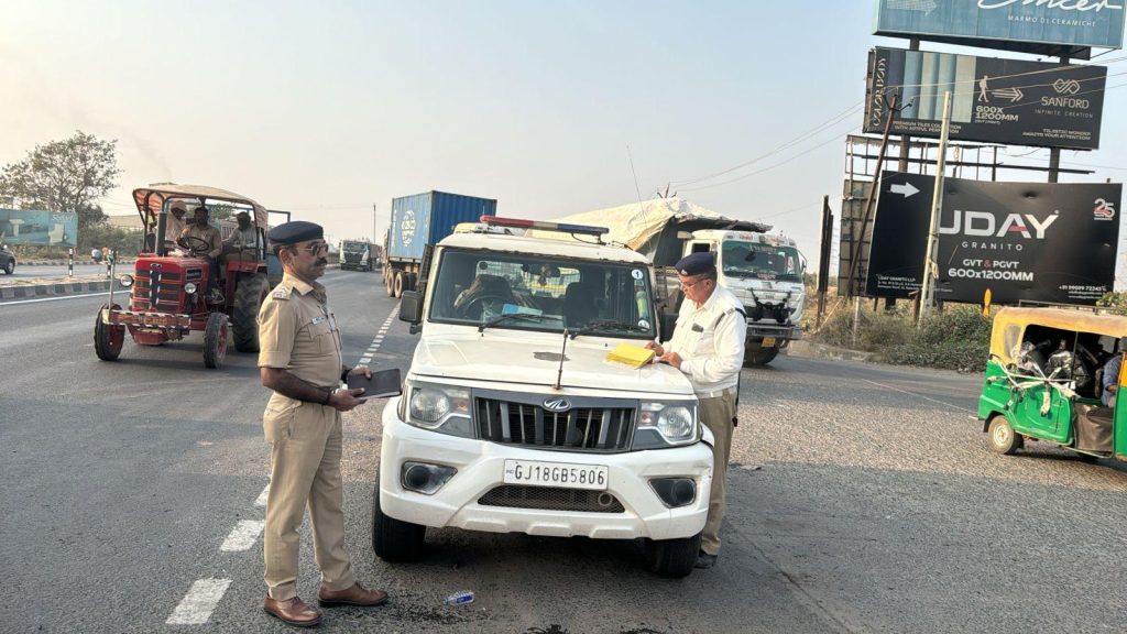 મોરબી જીલ્લામાં ટ્રાફિક નિયમોની સુયોગ્ય અમલવારી માટે ભારે વાહનોની સરપ્રાઈઝ વાહન ચેકિંગ ડ્રાઈવનું આયોજન કરાયું હતું જે વાહન ચેકિંગ ડ્રાઈવ દરમિયાન કુલ 450 વાહનો ચેક કર્યા હતા જેમાં નંબર પ્લેટ વગરના 13 મોટા વાહન ડીટેઈન, રોંગ સાઈડ/વધુ ગતિથી ચલાવતા વાહનચાલકો વિરુદ્ધ 18 ફોજદારી ગુના નોંધવામાં આવ્યા હતા. લાયસન્સ ના હોય તેવા 27 વાહનચાલકો પાસેથી સમાધાન શુલ્ક વસુલવામાં આવી હતી અને વાહનના કાગળો ના હોય તેવા 26 ભારે વાહન ચાલકો પાસેથી સમાધાન શુલ્ક કેસો કરવામાં આવ્યા હતા તે ઉપરાંત ઇંજછઙ નંબર પ્લેટ વગરના અને તૂટેલી નંબર પ્લેટ સહિતના 40 વાહનચાલકો સામે કેસ કરવામાં આવ્યા હતા બે કલાકના સરપ્રાઈઝ ચેકિંગ ડ્રાઈવ દરમિયાન કુલ રૂૂ 62,300 નો દંડ વસુલવામાં આવ્યો હતો.