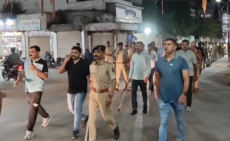 જેમા એસપી જયરાજસિંહ વાળા, ડીવાયએસપી વી.પી. માનસેતા, સાગર રાઠોડ, એલસીબી પી.આઈ. કે.કે. ગોહિલ, બી.જે. સરવૈયા, તેમજ અન્ય વિભાગના પી.આઈ., પી.એસ.આઈ. સાથે એલ.સી.બી. સહિતનો પોલીસ સ્ટાફ આ ફુટ પેટ્રોલિંગમાં જોડાયો હતો. શહેરના નગર ગેઈટ, જોધપુર ગેઈટ, પોસ્ટ ઓફિસ રોડ, ચાર રસ્તા વિગેરે વિસ્તારોમાં ફૂટ પેટ્રોલિંગ કરી અને કાયદાની સમીક્ષા સાથે જરૂૂરી માર્ગદર્શન આપવામાં આવ્યું હતું. (તસવીર: કુંજન રાડિયા)