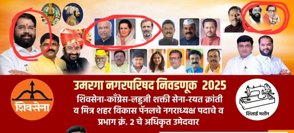 શિંદે અને ઉદ્ધવ ઠાકરેને ફક્ત મિત્રો તરીકે જ નહીં, પરંતુ કોંગ્રેસ સાથેના ગઠબંધન તરીકે જોવામાં આવે છે. ધારાશિવ જિલ્લાની ઓમેગા મ્યુનિસિપલ કાઉન્સિલમાં, શિંદેની શિવસેના કોંગ્રેસ સાથે જોડાઈ છે. શિવસેનાના ભૂતપૂર્વ સાંસદ રવિન્દ્ર ગાયકવાડે કોંગ્રેસ સાથે નવું જોડાણ બનાવ્યું છે. તેઓ ઓમેગા બેઠક પર ભાજપના હર્ષવર્ધન ચાલુક્ય સામે પ્રમુખ પદ માટે ચૂંટણી લડી રહ્યા છે. જલગાંવના ચોપડામાં, એકનાથ શિંદેના શિવસેનાના ધારાસભ્ય ચંદ્રકાંત સોનાવણેએ પ્રમુખ પદ માટે નજીકના સહયોગીને મેદાનમાં ઉતાર્યા છે, પરંતુ ભાજપ મેદાનમાં હોવાથી, તેમણે કોંગ્રેસ સાથે જોડાણ કર્યું છે. શિંદેનો ફોટો સોનિયા ગાંધી અને રાહુલ ગાંધી સાથે છે. આ સૂચવે છે કે ભાજપે ઘણી બેઠકો પર એકનાથ શિંદેના નેતાઓને પોતાના ઉમેદવારો તરીકે નામાંકિત કર્યા છે, અને તેઓએ હરીફ છાવણી સાથે જોડાણ કર્યું છે જેથી તેઓ હિસાબ મેળવી શકે.