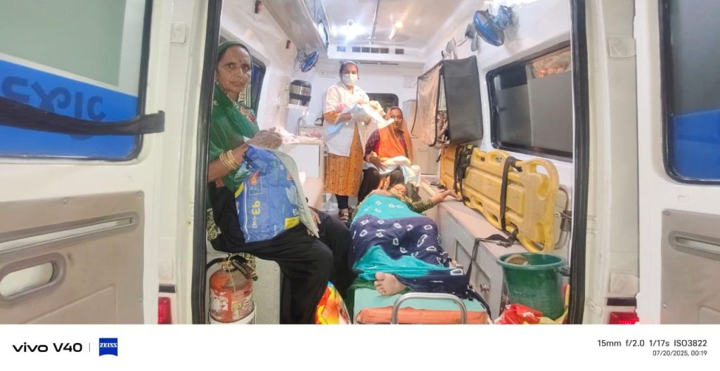 ત્યાંથી સગર્ભા મહિલા પુરીબેન કે જેઓને પ્રસુતિની પીડા ઉપડી હોવાથી તાત્કાલિક અસરથી એમ્બ્યુલન્સમાં લઈને જામનગર જી.જી. હોસ્પિટલ તરફ આવી રહ્યા હતા. પરંતુ પુરીબેન ની ચાલુ એમ્બ્યુલન્સમાં જ જામનગરની સરકારી જી.જી. હોસ્પિટલમાં પહોંચે તે પહેલાં તબિયત લથડી હતી, અને એમ્બ્યુલન્સમાં જ ફરજિયાત પ્રસુતિ કરાવવી પડે તેવા સંજોગો ઊભા થયા હતા. જેથી ઇ.એમ.ટી.ના સ્ટાફ દ્વારા અન્ય તબિબ ડો. પરમાર નો સંપર્ક સાઘી માર્ગદર્શન મેળવી લઈ એમ્બ્યુલન્સમાં જ પ્રસુતિ કરાવી હતી. અને એકીસાથે બે જોડીયા બાળકીઓને સફળતાપૂર્વક જન્મ આપી દીધો હતો. ત્યારબાદ માતા અને બંને પુત્રીઓને સારવાર માટે જામનગરની સરકારી જી.જી. હોસ્પિટલના ગાયનેક વિભાગમાં સમયસર પહોંચાડી દેવામાં આવ્યા હતા.