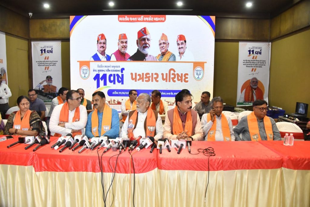 ભારતીય જનતા પાર્ટી દ્વારા સંકલ્પથી સિદ્ધિ સુધી 11 વર્ષ પૂર્ણ કાર્યક્રમ હેઠળ વિવિધ કાર્યક્રમોનું આયોજન કરવામાં આવી રહ્યુ છે. આ કાર્યક્રમ અંતર્ગત પ્રદેશ ભાજપની સુચના અનુસાર રાજકોટ શહેર ભાજપ પ્રમુખ ડો. માધવ દવેના માર્ગદર્શન હેઠળ આજ રોજ પ્રેસ કોન્ફરન્સ પ્રદેશ ઉપાધ્યક્ષ ડો.ભરતભાઈ બોઘરા અને લોકસભા સાંસદ પરશોતમભાઈ રૂૂપાલાની ઉપસ્થિતિમાં પ્રેસ કોન્ફરન્સ યોજવામાં આવી હતી.