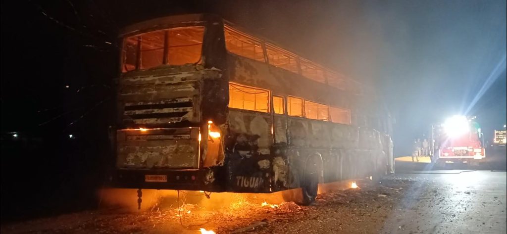 જોકે આગ ની લપેટ મા બસનું લોખંડ માત્ર બચ્યું હતું.બનાવ ના પગલે થોડીવાર માટે નેશનલ હાઇવે પર અફરા તફરી નો માહોલ છવાઈ ગયો હતો. બસ ની અંદર તેલ ના ડબ્બા કે અન્ય કોઈ જ્વલનશીલ પદાર્થ હોય તો તે ફાટવાનો ભય સતાવી રહ્યો હતો. નેશનલ હાઇવે પર વાહનો ની કતાર થઈ ગઈ હતી.જેને પગલે ફાયર ફાઈટર ને આવવું થોડું મુશ્કેલ થઈ પડ્યું હતું. અલંગ પો.સ.ઇ વાઢેર સહિત નો પોલીસ કાફલો તાબડતોબ દોડી આવ્યો હોય ટ્રાફિક નિયમન થઈ શકેલ. મામલતદાર જાની, નાયબ મામલતદાર સહિત પ્રસાશન દોડી આવેલ.ડ્રાઇવર કેબીન માંથી શોટસર્કિટ ના કારણે આગ લાગી હોવાનું પ્રાથમિક તારણ નીકળ્યું છે.