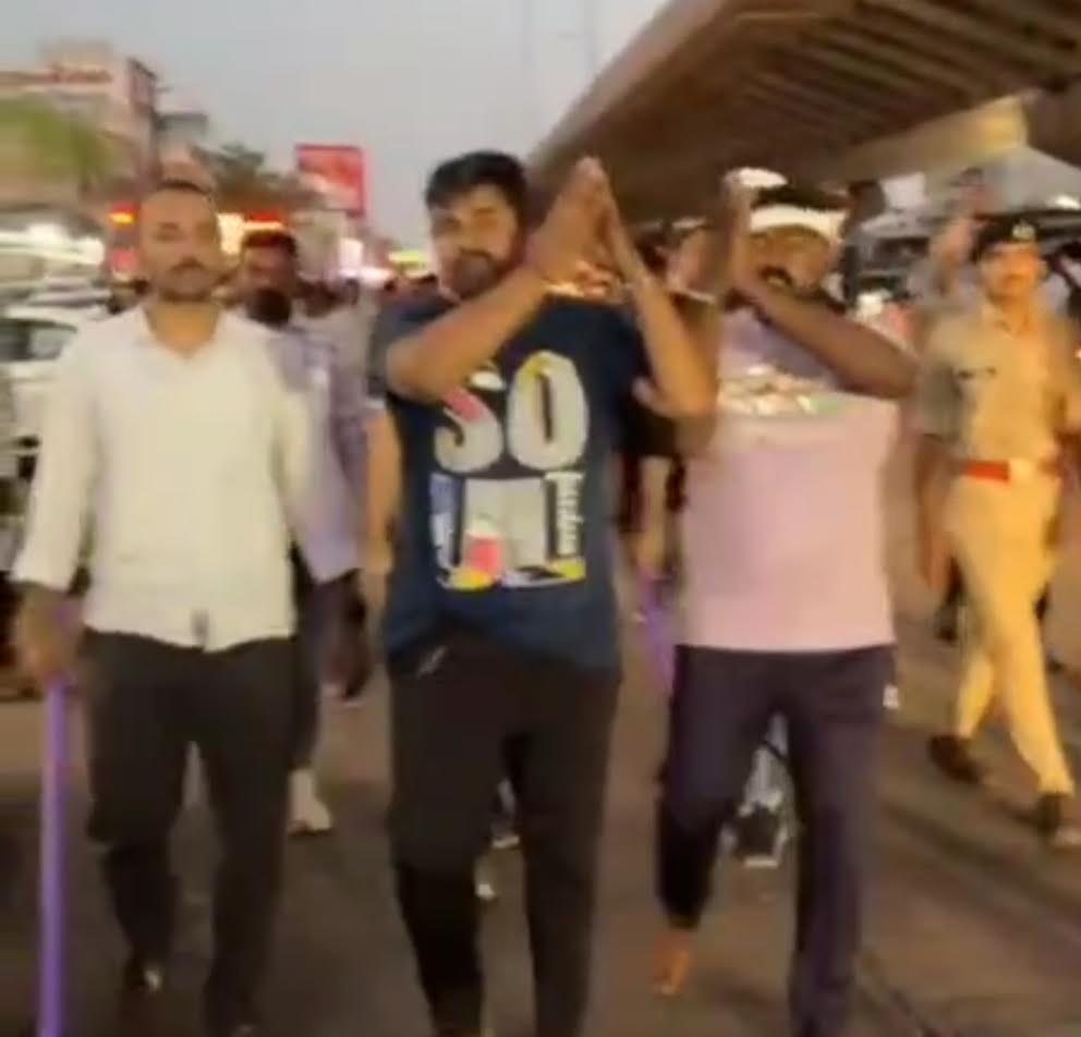 પોલીસ કમિશનર, જોઈન્ટ પોલીસ કમિશનર, ડીસીપી સજ્જનસિંહ પરમાર, એસીપી બી. વી. જાધવની સુચના મુજબ આજીડેમ પીઆઇ એ. બી. જાડેજા અને ટીમે આ ગુનામાં બે આરોપી સંજય રમેશભાઈ વાઘેલા (ઉ.વ.29-રહે. કોઠારીયા સોલવન્ટ હા.બો. ક્વાર્ટર નં. 839) તથા પ્રશાંત ત્રિલોકપરી ગોસ્વામી (ઉ.વ.31-રહે. ગાયત્રીનગર શાક માર્કેટ પાસે, સહકાર રોડ)ને ઝડપી લઇ ઘટના સ્થળે લઇ જઇ રિક્ધસ્ટ્રકશન કરાવ્યું હતું. બંનેએ હાથ જોડી હવે પછી આવુ નહિ કરીએ તેમ કહી માફી માંગી હતી. ડી. સ્ટાફની ટીમે સીસીટીવી કેમેરા અને વાયરલ વિડીયોને આધારે બંનેને શોધી કાઢયા હતાં.