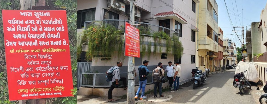 રાજકોટનાં પેલેસ રોડની પાછળ આવેલા રાજકોટના વર્ધમાનનગર વિસ્તારમાં હાલ તંગદિલીનો માહોલ જોવા મળી રહ્યો છે. સ્થાનિક રહીશો દ્વારા પોતાના વિસ્તારમાં બેનરો લગાડવામાં આવ્યા છે, જેમાં વિધર્મી અને પરપ્રાંતિ લોકોને મકાન ભાડે કે વેચાણથી નહીં આપવાની અપીલ કરવામાં આવી છે. આ બેનરોએ શહેરભરમાં ચર્ચા જગાવી છે.વર્ધમાનનગરના રહીશોનો આક્ષેપ છે કે, વિસ્તારમાં પરપ્રાંતિ લોકો ઘરો ભાડે રાખીને ઔદ્યોગિક એકમો ચલાવી રહ્યા છે.