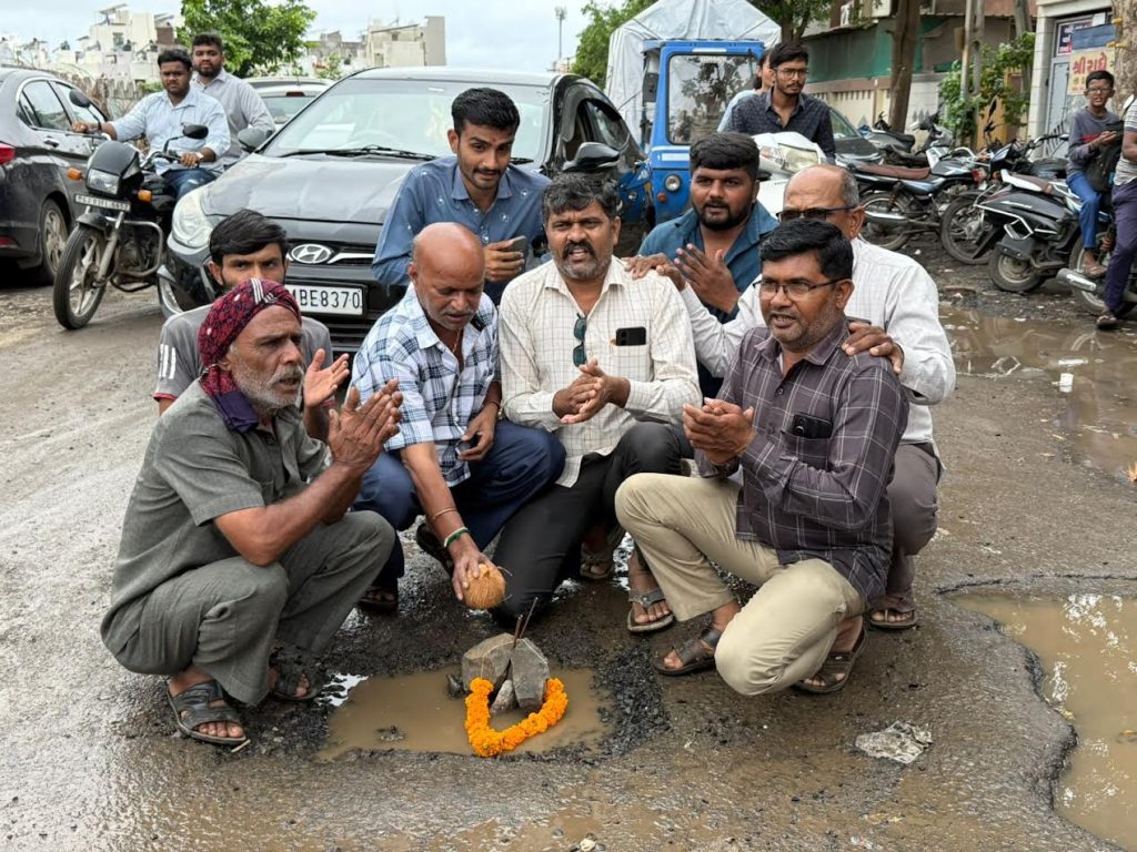 \રાજકોટ શહેરના મવડી વિસ્તારના બાપા સીતારામ ચોક પાસે રોડની બિસ્માર સ્થિતિને લઈને આજે કોંગ્રેસ પક્ષ દ્વારા અનોખો વિરોધ નોંધાવવામાં આવ્યો હતો. રોડ પર પડેલા ઊંડા ખાડાઓને હાર પહેરાવી, શ્રીફળ ચડાવી અને અગરબત્તી કરીને તેમનું પૂજન કરવામાં આવ્યું, જેથી તંત્રની નિષ્ક્રિયતા સામે વ્યંગાત્મક રીતે ગુસ્સો વ્યક્ત કરવામાં આવ્યો.