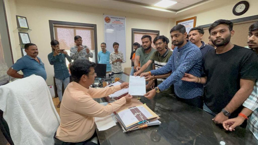 સૌરાષ્ટ્ર યુનિવર્સિટી અવાર નવાર વિવાદો માં આવતી હોય છે જ્યારે બે દિવસ પેલા કેટલીક પીડિત વિધાર્થીનીઓ દ્વારા તેના પ્રોફેસર સંજય પંડ્યા દ્વારા હેરેસ્ટમેન્ટ અને ભેદભાવ થતો હોય તેવી ફરિયાદ મહિલા આયોગ માં કરવામાં આવી છે તે ખૂબ ગંભીર બાબત છે શિક્ષણ ધામ માં આવા ગંભીર ઘટનાઓ બનતી હોય જે સમગ્ર માનવ સમાજ માટે શર્મનાક છે. જેથી અમે માંગ કરીએ છીએ કે આ વિદ્યાર્થીનીઓને ન્યાય આપવામાં આવે અન્યથા ગુજરાત એનએસયુઆઇ દ્વારા આવનારા દિવસો માં સૌરાષ્ટ્ર યુનિવર્સિટીનો ઘેરાવ કરી ઉગ્રથી ઉગ્ર વિરોધ પ્રદશન કરવામાં આવશે. તેમ કુલપતિને પાઠવે આવેદનમાં ચિમકી ઉચ્ચારવામાં આવી છે. (તસવીર: મુકેશ રાઠોડ)