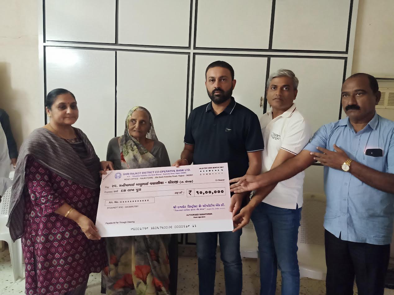 ધોરાજી શહેરની ધોરાજી વિવિધ કાર્યકારી સહકારી મંડળી લી.ના ખેડુત સભાસદ મનીષભાઈ બચુભાઈ વઘાસીયાનુ અકસ્માતે દુ:ખદ અવસાન થતા રાજકોટ જીલ્લા બેંક દ્વારા લેવાયેલ રૂૂ.10/- લાખ તેમજ…