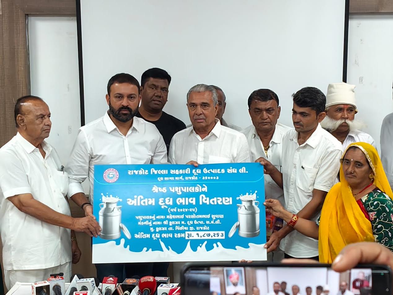 રાજકોટ ડિસ્ટ્રી. કો-ઓપ. બેંકના ચેરમેન, ઈફકોના ડિરેક્ટર અને યુવા ધારાસભ્ય જયેશભાઈ રાદડીયાના માર્ગદર્શન અને હાજરીમાં રાજકોટ દૂધ સંઘનાં અધ્યક્ષશ્રી ગોરધનભાઈ ધામેલીયા, ઈ.મેનેજીંગ ડિરેકટર અને નિયામક મંડળના સભ્યો દ્વારા સંઘ સાથે જોડાયેલા હજારો દૂધ ઉત્પાદકોના આર્થિક અને સામાજિક હિતોને ધ્યાનમાં રાખીને વર્ષ 2024-25 નાં નફામાંથી રાજકોટ ડેરીના ઈતિહાસમાં સૈાથી ઉચો પ્રતિ કીલો ફેટે રૂૂા.60 લેખે 821 મંડળીઓના 60590 દૂધ ઉત્પાદકોને કુલ રૂૂા.60 કરોડ ની જંગી રકમનો વચગાળાનો અંતિમ દૂધ ભાવ ચુકવવાની જાહેરાત કરવામાં આવેલ.
