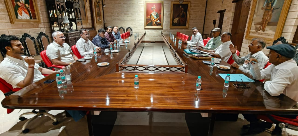 રાજકોટ શહેરની ઐતિહાસિક ધરોહર સમા જુના દરબારગઢ ખાતે રાજકોટ જિલ્લા રાજપૂત સમાજના ટ્રસ્ટીઓની પારિવારિક અને ભાવનાત્મક માહોલમાં બેઠક યોજાઈ ગઈ જેમાં વર્તમાન અને ભવિષ્યના મુદ્દાને ધ્યાને લઈ વિવિધ પ્રશ્નોની છણાવટ કરી સકારાત્મક અને હકારાત્મક અભિગમ સાથે સામાજિક ઉત્તરદાયિત્વ નિભાવવાની રૂૂપરેખા ઘડી કાઢવામાં આવશે.