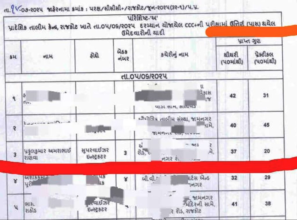 રાજકોટ સ્પિપા ખાતે યોજાયેલ સીસીસી પ્લસની પરીક્ષાનું પરિણામ જાહેર થયું છે. તેમાં થિયેરી કે પ્રેક્ટિકલના પેપરમાં ઓછામાં ઓછા 25 માર્કસ હોય તો જ ઉમેદવાર પાસ થાય છે. પરંતુ પરિણામમાં 50માંથી 20 માર્કસ હોવા છતાં એક ઉમેદવારને પાસ કરી દેવાયાનો દાવો યુવરાજસિંહ જાડેજાએ કરી આ અંગેના પુરાવા પણ જાહેર કર્યા છે.