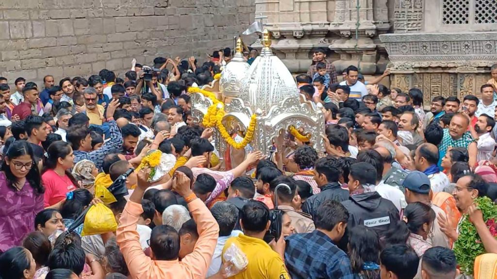 ઠાકોરજીના બાલસ્વરૂૂપને ચાંદીના રથમાં બેસાડી બેન્ડવાજા તેમજ શરણાઈના શુરોના ધાર્મીક ભજનો સાથે જગત મંદિર પટાગણમાં ચાર પરીક્રમાં કરાવામાં આવી હતી.