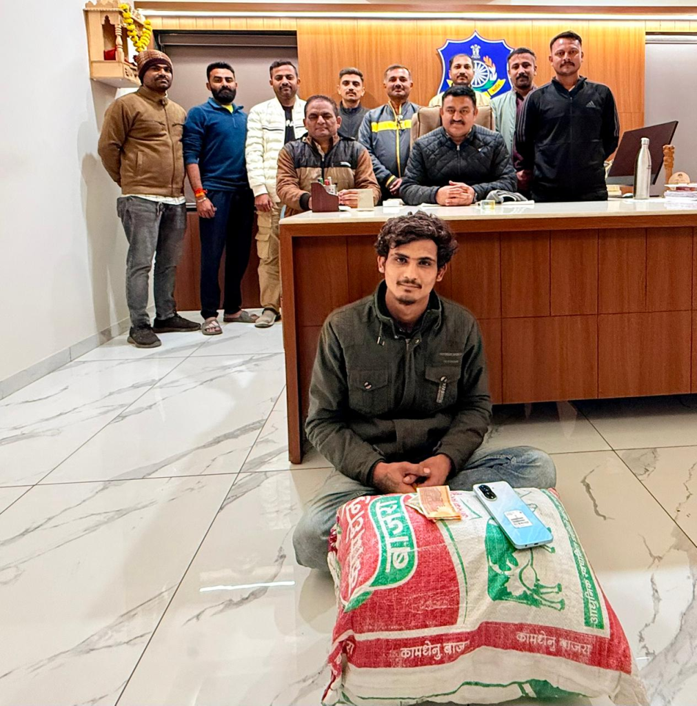 મળતી વિગતો મુજબ એસઓજીના સ્ટાફને મળેલી બાતમીને આધારે ભીમરાવનગર, માંડા ડુંગર પાસે રહેતા અશ્વિન ઉર્ફે જોગીડો પ્રવીણ સોલંકી (ઉ.વ.22,)ને ઝડપી લીધો હતો ડાકલા વગાડવાનું કામ કરતો અશ્વિન ગાંજો વેચતો હોવાની ચોક્કસ બાતમી મળતાં એસઓજીએ તેની ધરપકડ કરી તપાસ કરતા તેની પાસે રહેલા કોથળાની તલાશી લેતા અંદરથી રૂૂ.1.82 લાખનો 3.646 કિલોગ્રામ ગાંજો મળી આવ્યો હતો. રોકડ, મોબાઈલ અને ટુ-વ્હીલર મળી કુલ રૂૂા. 2.43 લાખનો મુદ્દામાલ કબજે કર્યો હતો. એસઓજીના સૂત્રોએ જણાવ્યું કે છેલ્લા ઘણા સમયથી અશ્વિને ગાંજાનો વેપલો શરૂૂ કર્યો હતો.