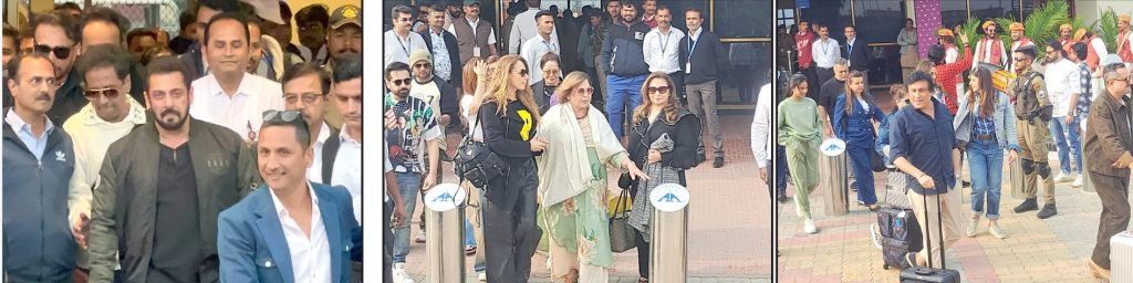વિશ્વવિખ્યાત રિલાયન્સ ઇન્ડસ્ટ્રીઝના 25મા વર્ષ અને સ્વ. ધીરુભાઈ અંબાણીના જન્મદિવસની ઉજવણીમાં જામનગર એરપોર્ટ પર બોલિવૂડ સ્ટાર્સનું આગમન થઈ રહ્યું છે. છેલ્લા ત્રણ દિવસથી અનેક ફિલ્મ કલાકારો ખાસ વિમાન માર્ગે જામનગર આવી રહ્યા છે અને રિલાયન્સ ગ્રીન્સ ખાતે યોજાનારા ચાર દિવસીય રંગારંગ કાર્યક્રમોમાં ભાગ લઈ રહ્યા છે. આજે સાહિલ ખાન, સલમાન ખાન, તેમની માતા, લુલિયા અને રિતેશ દેશમુખ સહિતના કલાકારો જામનગર પહોંચ્યા હતા. ગઈકાલે કોકિલાબેન અંબાણી, મુકેશ અંબાણી અને પરિવારના અન્ય સભ્યો પણ જામનગર આવી પહોંચ્યા હતા. રિલાયન્સના સ્થાપકના જન્મદિવસની ઉજવણીમાં આટલા મોટા પ્રમાણમાં બોલિવૂડ સેલિબ્રિટીઝનું આગમન જામનગર માટે ગૌરવની વાત છે.