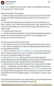 મુસાફરે સોશિયલ મીડિયા પોસ્ટમાં લખ્યું: “મારા પરિવારને સ્ટાફ દ્વારા ઉપયોગમાં લેવાતી સુરક્ષા ચેક લાઇનમાં પ્રવેશવાનું કહેવામાં આવ્યું કારણ કે અમારી સાથે 4 મહિનાનું બાળક સ્ટ્રોલરમાં હતું. સ્ટાફ મારી સામે લાઇન તોડી રહ્યો હતો.” જ્યારે મેં વાંધો ઉઠાવ્યો, ત્યારે કેપ્ટન વીરેન્દ્ર ગુસ્સે થયા અને પૂછ્યું, “શું તમે અભણ છો અને ‘આ પ્રવેશ ફક્ત સ્ટાફ માટે છે?’ લખેલું બોર્ડ વાંચી શકતા નથી?”