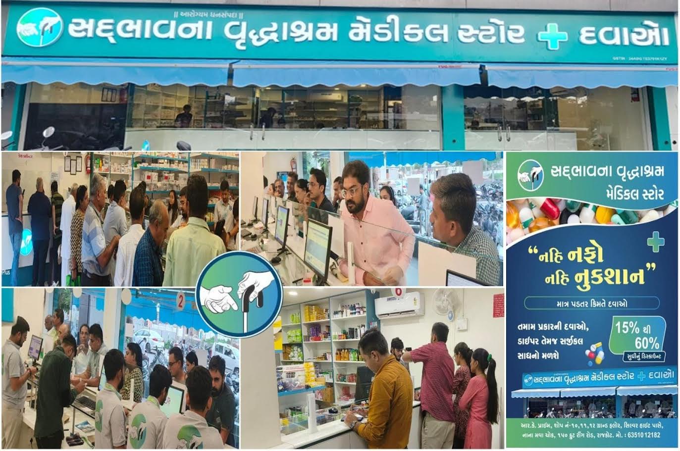 સદભાવના વૃદ્ધાશ્રમ મેડીકલ સ્ટોર, (નાના મવા ચોક, આર.કે.પ્રાઈમ, સિલ્વર હાઈટસ પાસે, રાજકોટ) ખાતે ચાલી રહેલ, સદભાવના વૃદ્ધાશ્રમના મેડિકલ સ્ટોરમાં અત્યારે રોજનું 8 લાખ રૂૂપિયાની દવાઓનું વેંચાણ થઈ રહ્યું છે અને માત્ર સાત મહિનાના ટૂંકા ગાળામાં સમગ્ર પણે કરોડો રૂૂપિયાની રાહત દર્દીઓને અપાઈ ચુકી છે, 20% થી લઈ 65% સુધી ડિસ્કાઉન્ટ અપાય છે, એટલે કે સદભાવના વૃદ્ધાશ્રમ મેડીકલ સ્ટોર દર્દીનારાયણ, દરિદ્ર નારાયણની સેવા માટે ભગીરથ કાર્ય કરવામાં નિમિત બન્યું છે. 35 લોકોનો સ્ટાફ કાર્યરત છે, દર મહિને 22 હજાર જેટલા દર્દીઓ લાભ લ્યે છે. અત્યાર સુધીમાં 9 કરોડથી વધુ રકમની દવાઓનું વેંચાણ કરવામાં આવ્યું છે. અઢી કરોડનું ડિસ્કાઉન્ટ આપવામાં આવ્યું છે.