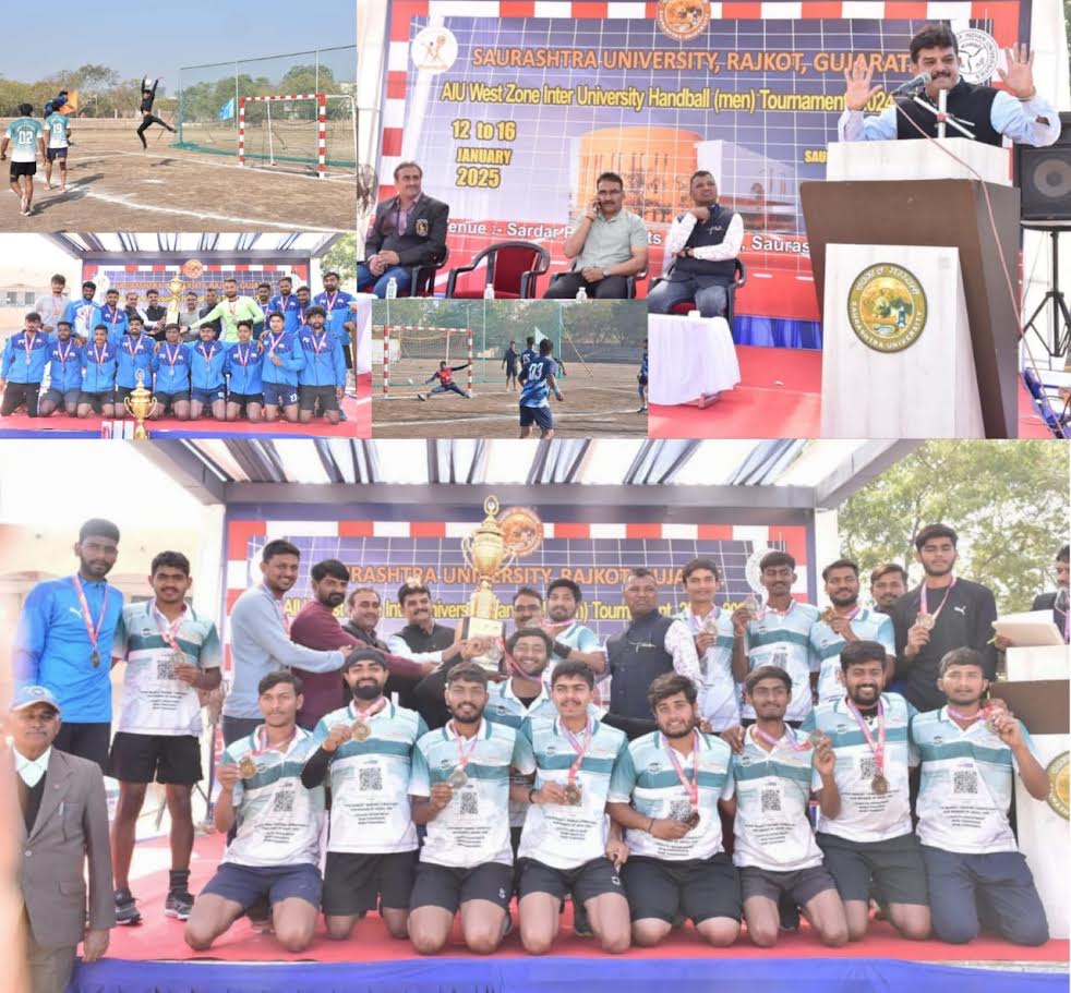 સૌરાષ્ટ્ર યુનિવર્સિટીના ઈતિહાસમાં સૌપ્રથમવાર નેશનલ હેન્ડબોલ મેન ટુર્નામેન્ટમાં સૌરાષ્ટ્ર યુનિવર્સિટીની ટીમ ચેમ્પિયન બની છે.આ ટુર્નામેન્ટની કલોઝીંગ સેરેમની ક્રિકેટ ગ્રાઉન્ડ, સરદાર વલ્લભભાઈ પટેલ સ્પોર્ટ્સ કોમ્પ્લેક્સ ખાતે કુલપતિની અધ્યક્ષતામાં યોજાઈ. સૌરાષ્ટ્ર યુનિવર્સિટીના કુલપતિ પ્રોફે. ઉત્પલભાઈ જોશીએ સૌરાષ્ટ્ર યુનિવર્સિટીની હેન્ડબોલની ટીમ, કોચ તથા શારીરિક શિક્ષણ નિયામક ડો. હરીશભાઈ રાબાને શુભેચ્છાઓ પાઠવી હતી.આ તકે કુલપતિએ જણાવ્યું હતું કે, ઘરઆંગણે નેશનલ હેન્ડબોલ મેન ટુર્નામેન્ટમાં ચેમ્પિયન બની છે, સૌરાષ્ટ્ર યુનિવર્સિટી ગૌરવ અનુભવે છે. ગુજરાત રાજય સરકાર પણ રમત ગમત ક્ષેત્રમાં યુવાનો ખુબ આગળ આવે એ માટે વિવિધ સુવિધાઓ આપીને રમતવીરોના કૌવતને ઉંચી ઉડાન આપવાનું કાર્ય કરી રહી છે.