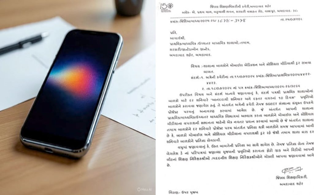 અમદાવાદના જિલ્લા શિક્ષણ અધિકારીએ તમામ શાળાઓને એક પરિપત્ર કર્યો છે અને તેમાં ઉલ્લેખ કર્યો છે કે, બાળકોને મોબાઈલથી દૂર રાખો અને સપ્તાહમાં એક દિવસ મોબાઈલનો ઉપયોગ ટાળવા માટે પ્રતિજ્ઞા લેવડાવો, આ પ્રતિજ્ઞા શાળામાં લેવડાવાની રહેશે તેવો પરિપત્ર તમામ શાળાઓને કરવામાં આવ્યો છે.
