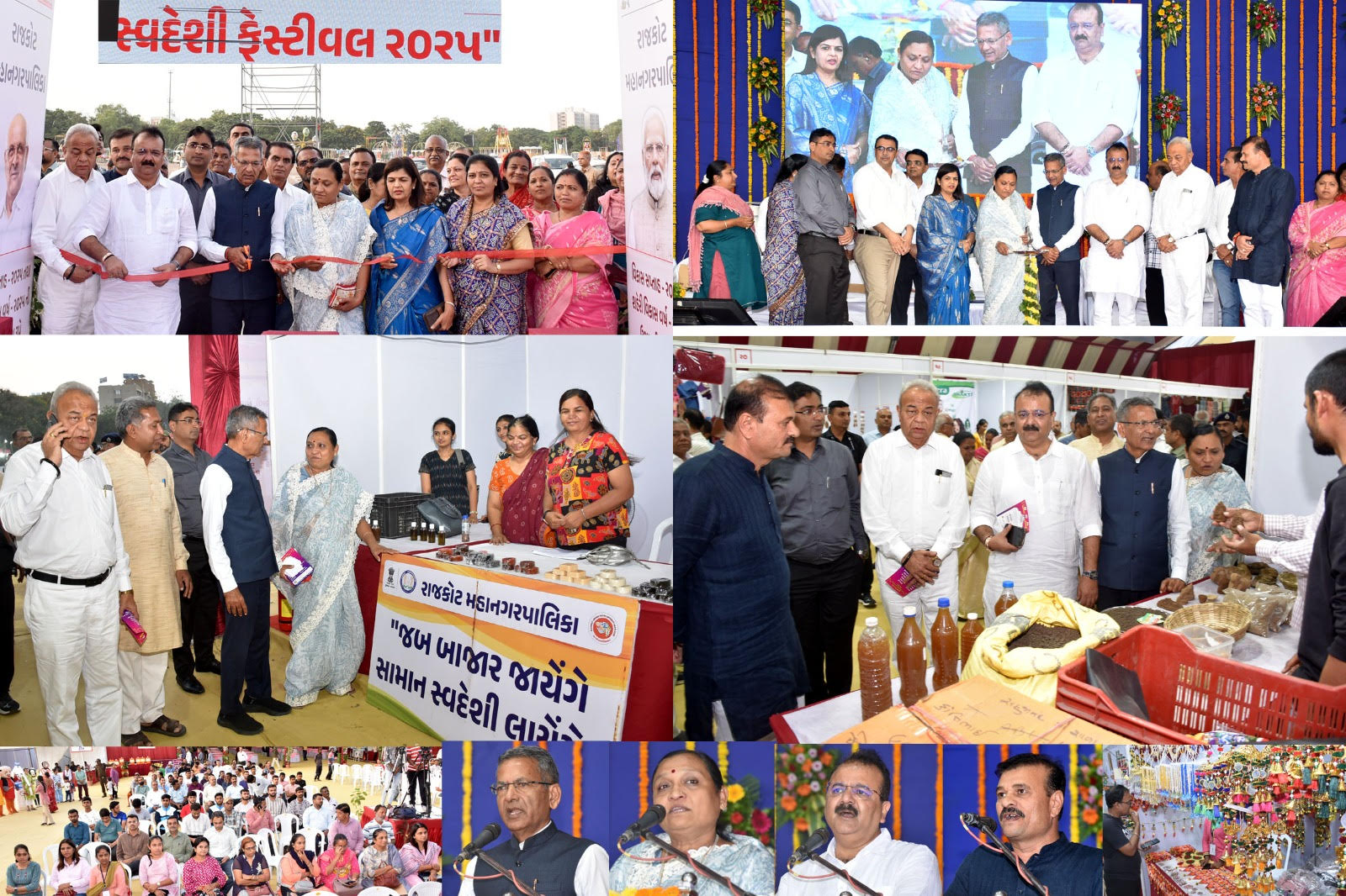 રાજકોટ મહાનગરપાલિકા દ્વારા તા.10-10-2025 થી તા.15-10-2025 સુધી યોજીત સ્વદેશી મેળા-2025શોપિંગ ફેસ્ટીવલનો માન. ધારાસભ્ય રમેશભાઈ ટીલાળાના વરદ હસ્તે શુભારંભ કરાયો દેશના આદરણીય પ્રધાનમંત્રી નરેન્દ્રભાઈ મોદીના મેક ઇન ઇન્ડિયા, એક જીલ્લો – એક ઉત્પાદનથ અને આત્મનિર્ભર ભારતના વિઝનને સાકર કરવા અને ભારત દેશને વર્ષ 2047 સુધીમાં વિકસિત ભારત બનાવવાના વિઝન સાકાર કરવા માટે સ્વદેશી ઉત્પાદનો અને સેવાઓના ઉપયોગને પ્રોત્સાહન આપવા, ગુજરાત સરકારના શહેરી વિકાસ અને શહેર ગૃહ નિર્માણ વિભાગની અધિસૂચના અન્વયે રાજકોટ મહાનગરપાલિકા દ્વારા શહેરી વિકાસ વર્ષ-2025ની ઉજવણી અંતર્ગત તા.10-10-2025 થી તા.15-10-2025 દરમ્યાન રેસકોર્ષ ગ્રાઉન્ડ ખાતે યોજાયેલ સ્વદેશી મેળો-2025-શોપિંગ ફેસ્ટીવલનો શુભારંભ તા.10-10-2025ને શુક્રવારે, સમય સાંજે 05:30 કલાકે, ધારાસભ્ય રમેશભાઈ ટીલાળાના વરદ હસ્તે કરવામાં આવ્યો હતો. આ કાર્યક્રમના અધ્યક્ષ સ્થાને મેયર નયનાબેન પેઢડીયા ઉપસ્થિત રહ્યા હતાં.