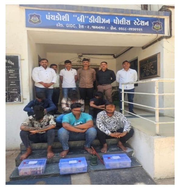 જામનગર નજીક દરેડમાં વીજ તંત્રના માલ સામાનના વજનમાં ગોટાળા કરવાના ગુનામાં પકડાયેલા છ આરોપીઓ