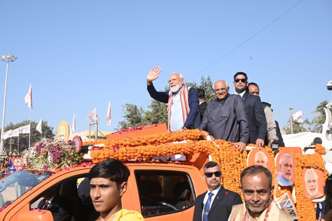 સોમનાથ સ્વાભિમાન પર્વની ઐતિહાસિક શૌર્યયાત્રામાં શિવભક્તોનું અભિવાદન જીલતા વડાપ્રધાન મોદી