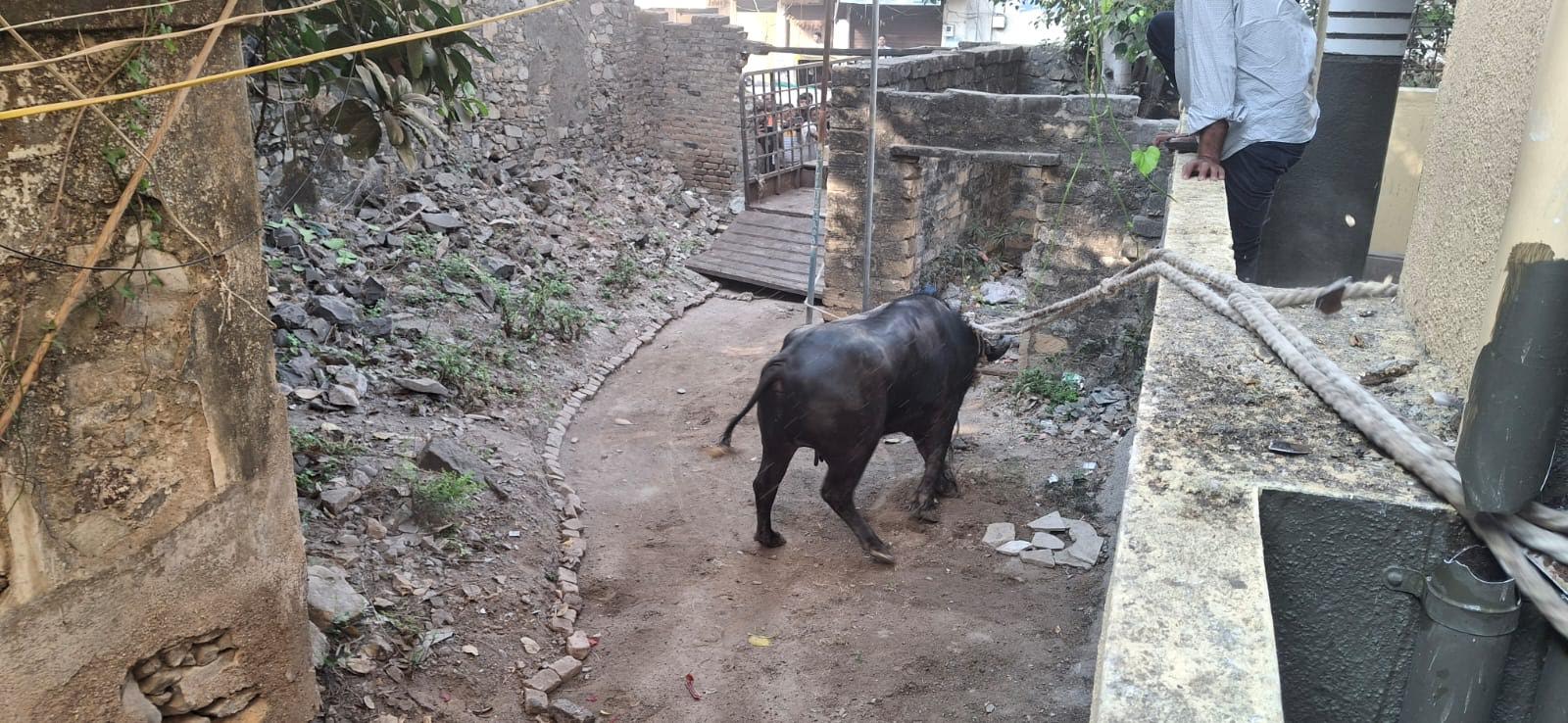 ફાયરની ટીમે અડધો કલાકની જહેમત બાદ ભેંસને પકડી ઢોરના ડબ્બામાં મૂકી દીધી