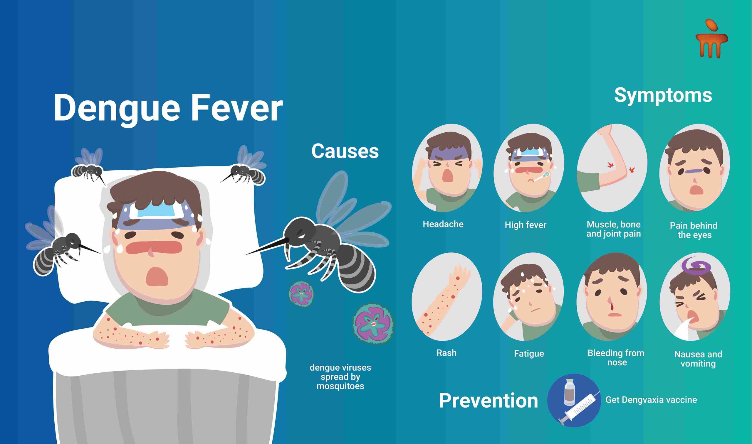 ડેન્ગ્યુની શરૂૂઆત તીવ્ર તાવ, માથાનો દુખાવો, આંખોની પાછળ દુખાવો, સાંધા અને સ્નાયુઓમાં દુખાવો, થાક, ઉબકા, ઉલ્ટી થાય છે.